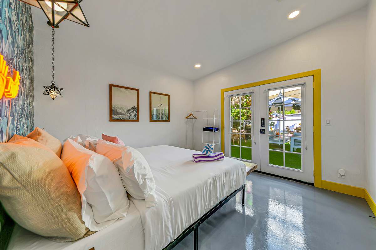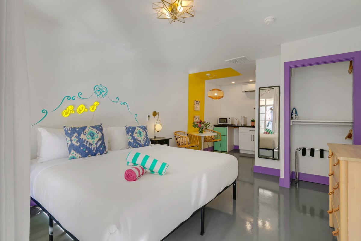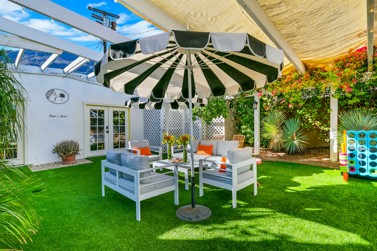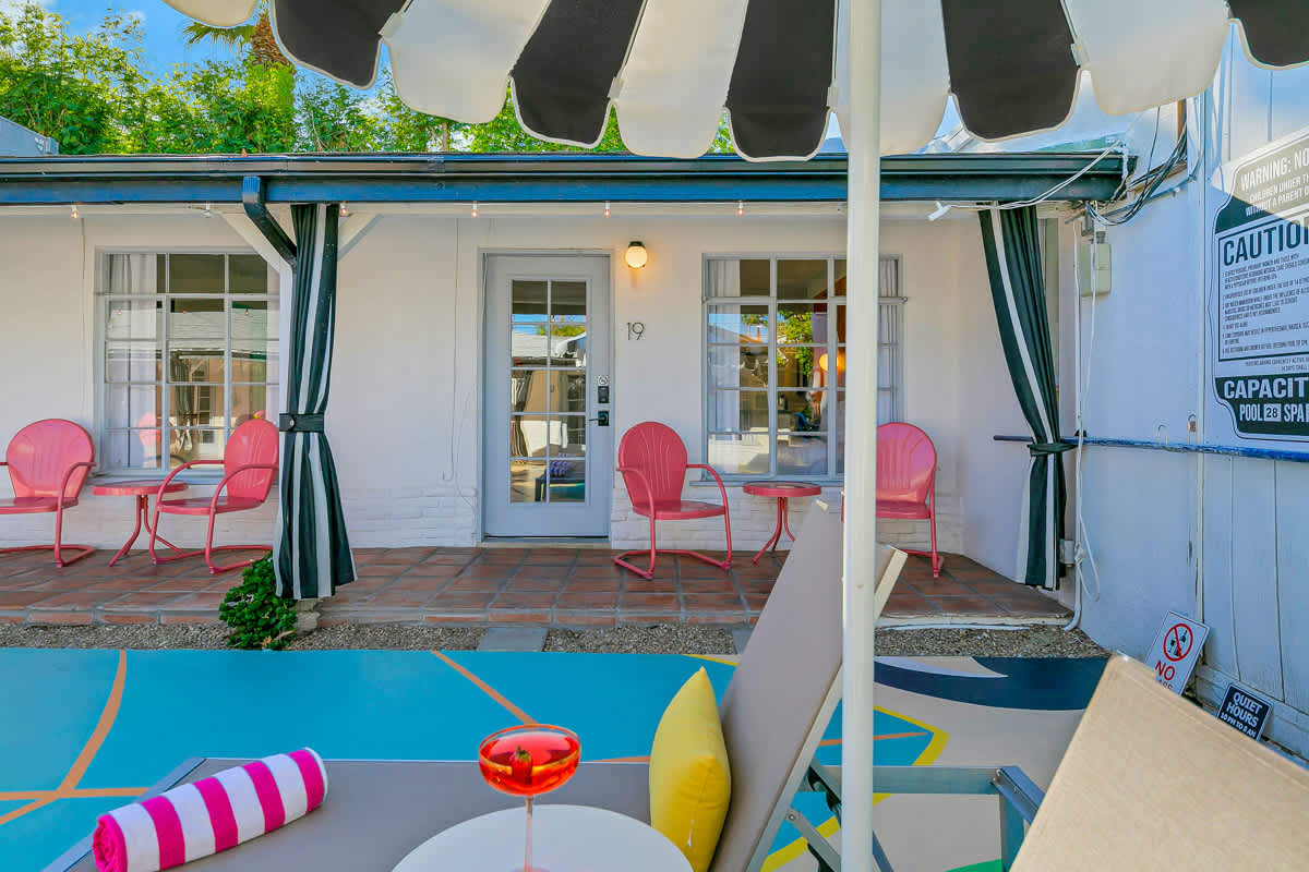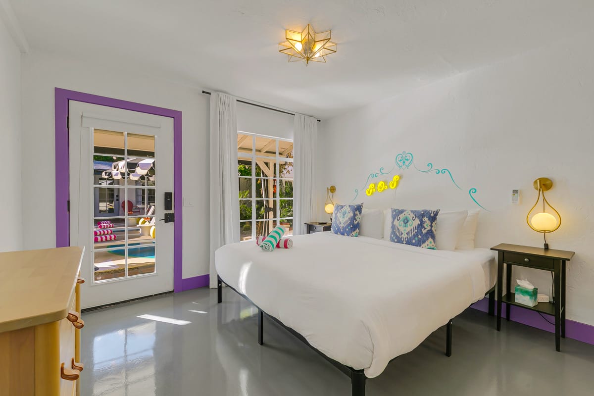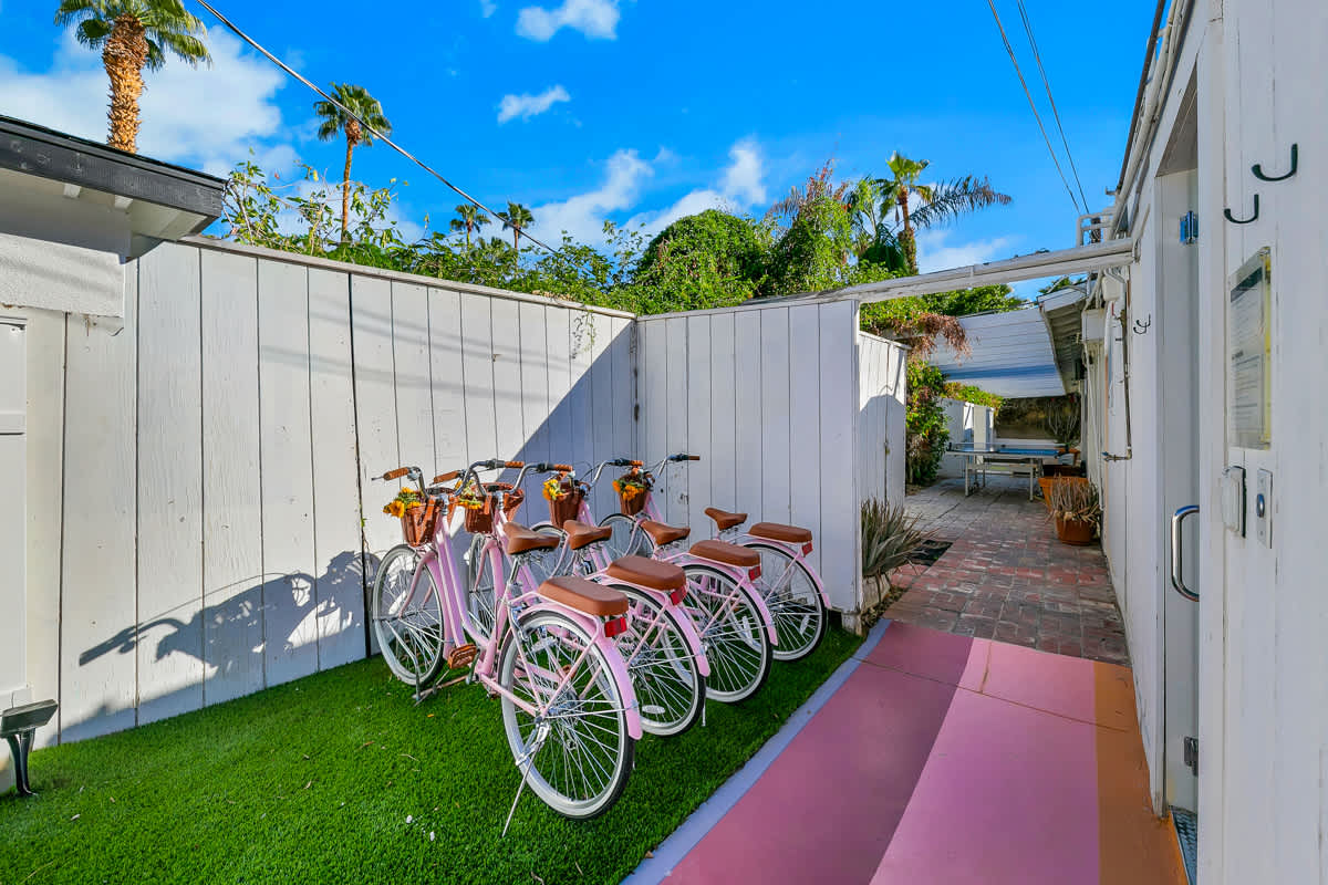 Spirit of Sofia’s Poolside Adventure is the most Palm Springiest experience in all of Palm Springs! Located in Downtown Palm Springs, Spirit of Sofia is framed by the backdrop of mountains, palm trees, and midcentury modern homes. Step outside your room/cabana and right into the pool. Spirit of Sofia has it all with heated pool, hot tub, grill, outdoor kitchen and dining, floaties, neon signs, bright colors, rainbows, road bikes, and ample cozy spaces 🙂