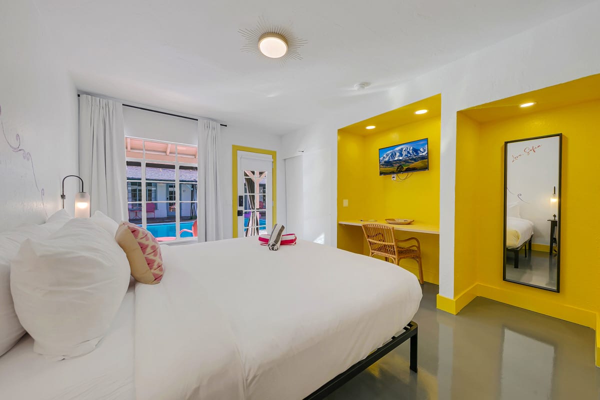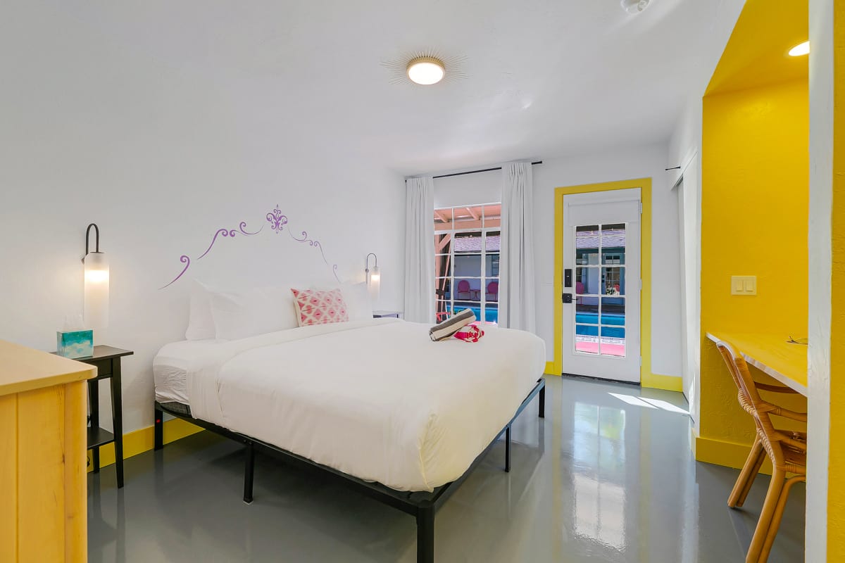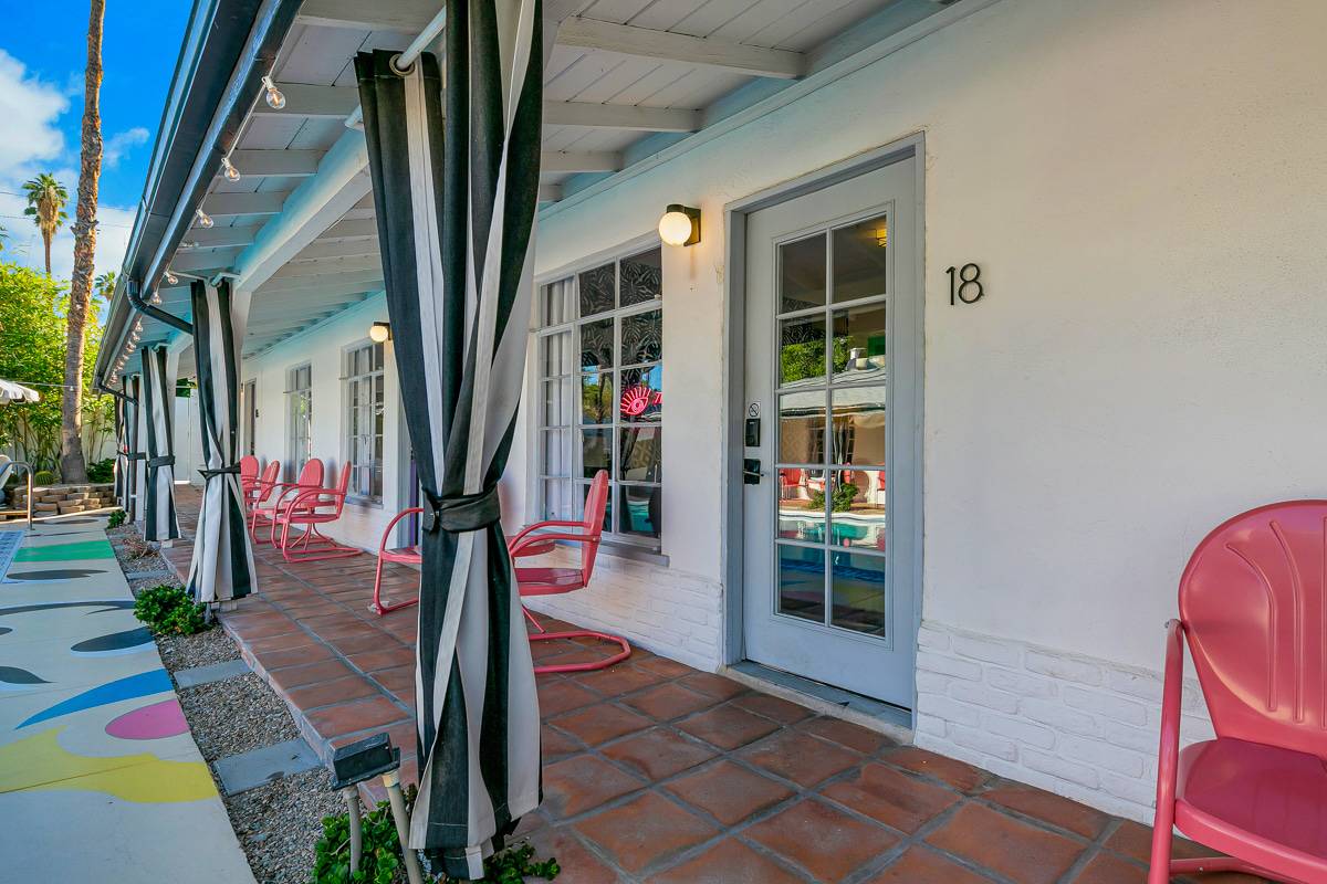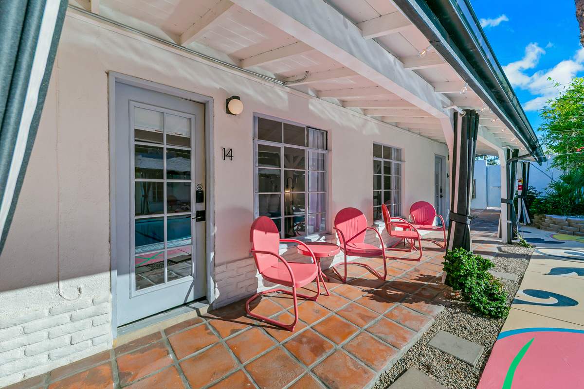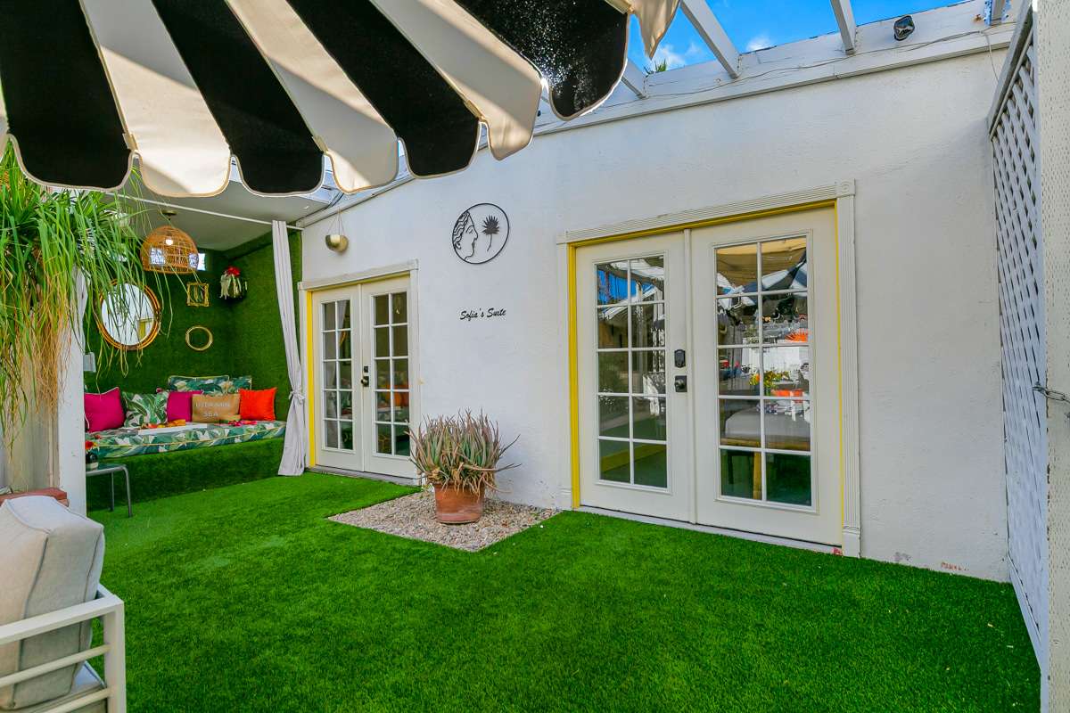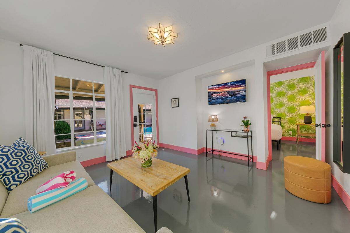 Spirit of Sofia’s Poolside Adventure is the most Palm Springiest experience in all of Palm Springs! Located in Downtown Palm Springs, Spirit of Sofia is framed by the backdrop of mountains, palm trees, and midcentury modern homes. Step outside your room/cabana and right into the pool. Spirit of Sofia has it all with heated pool, hot tub, grill, outdoor kitchen and dining, floaties, neon signs, bright colors, rainbows, road bikes, and ample cozy spaces 🙂