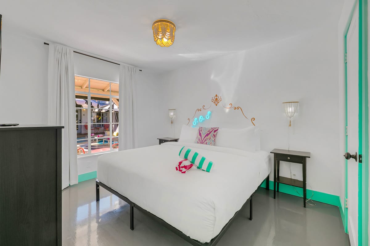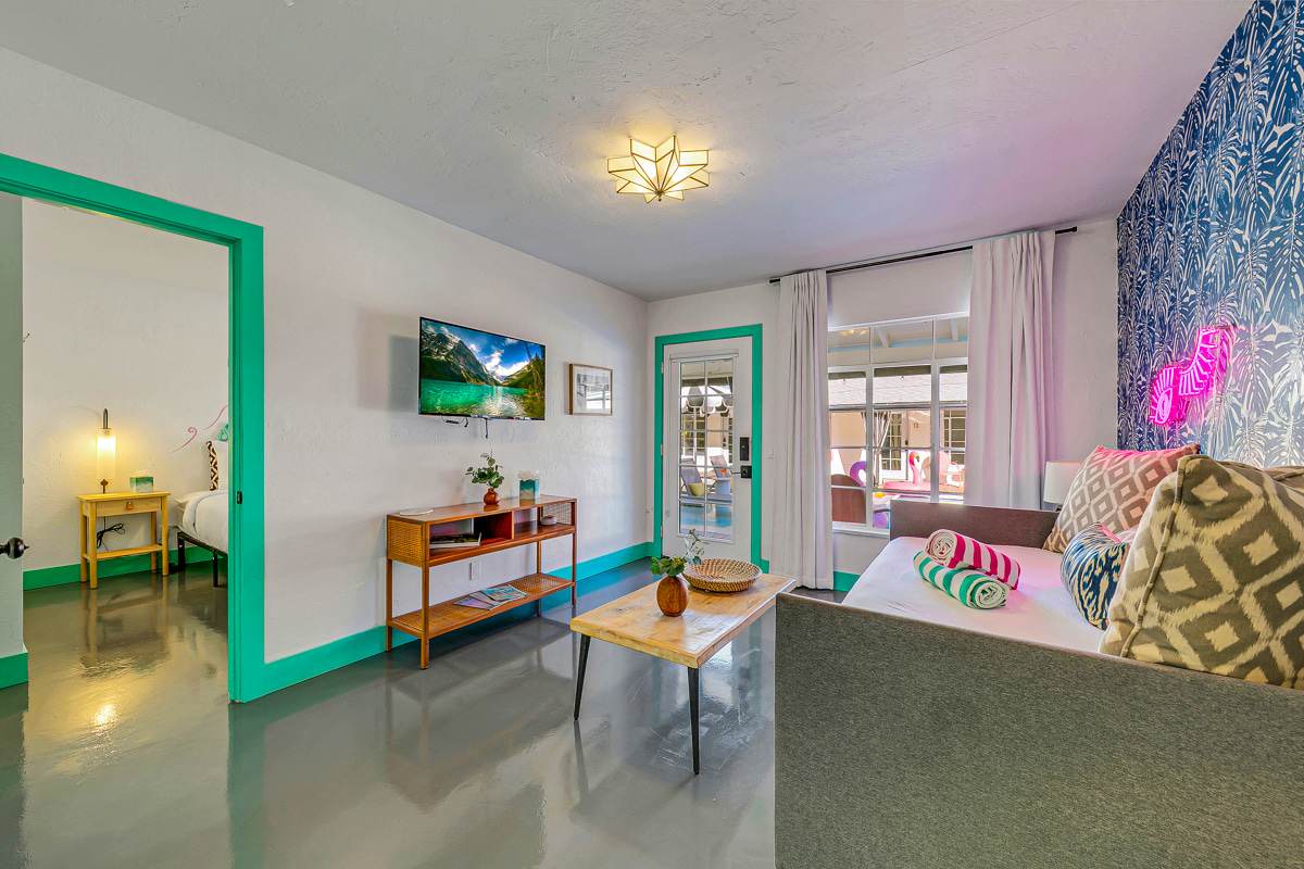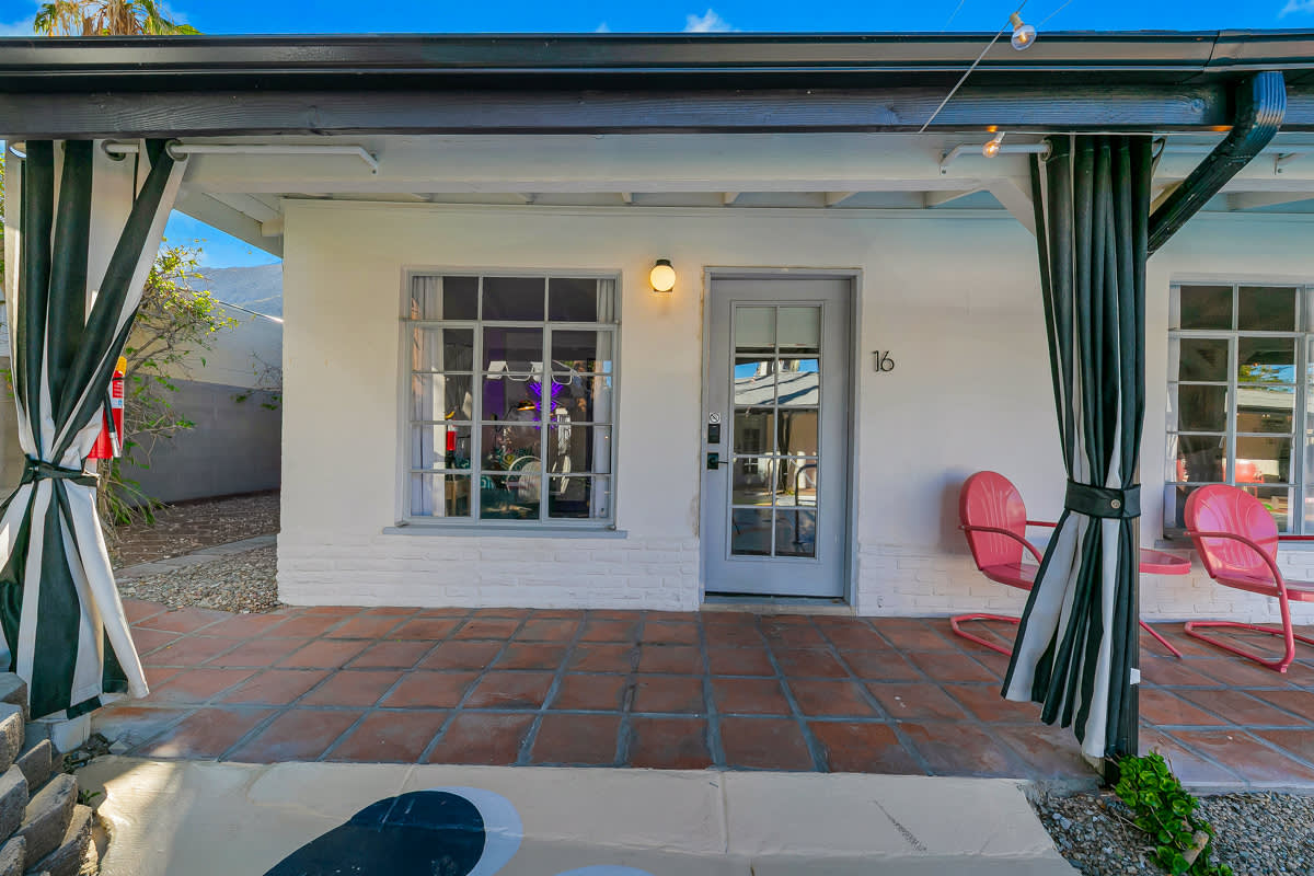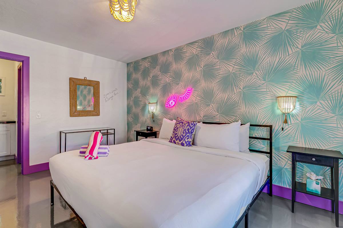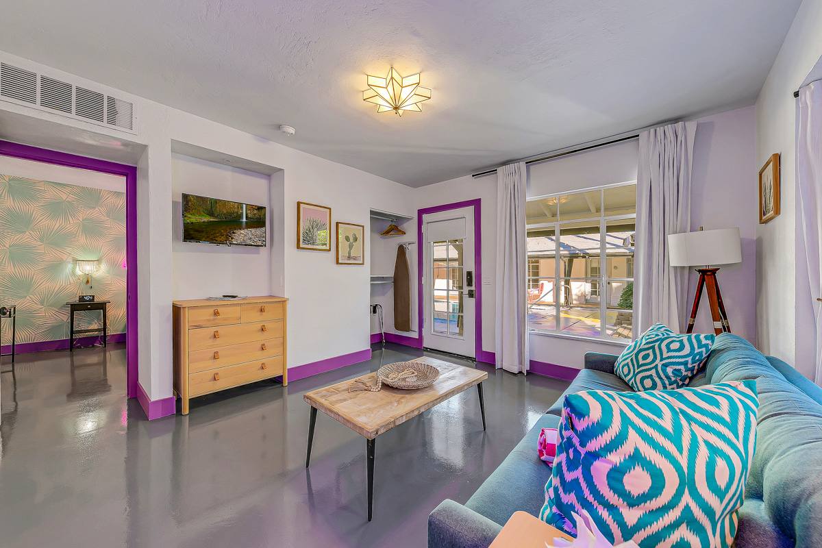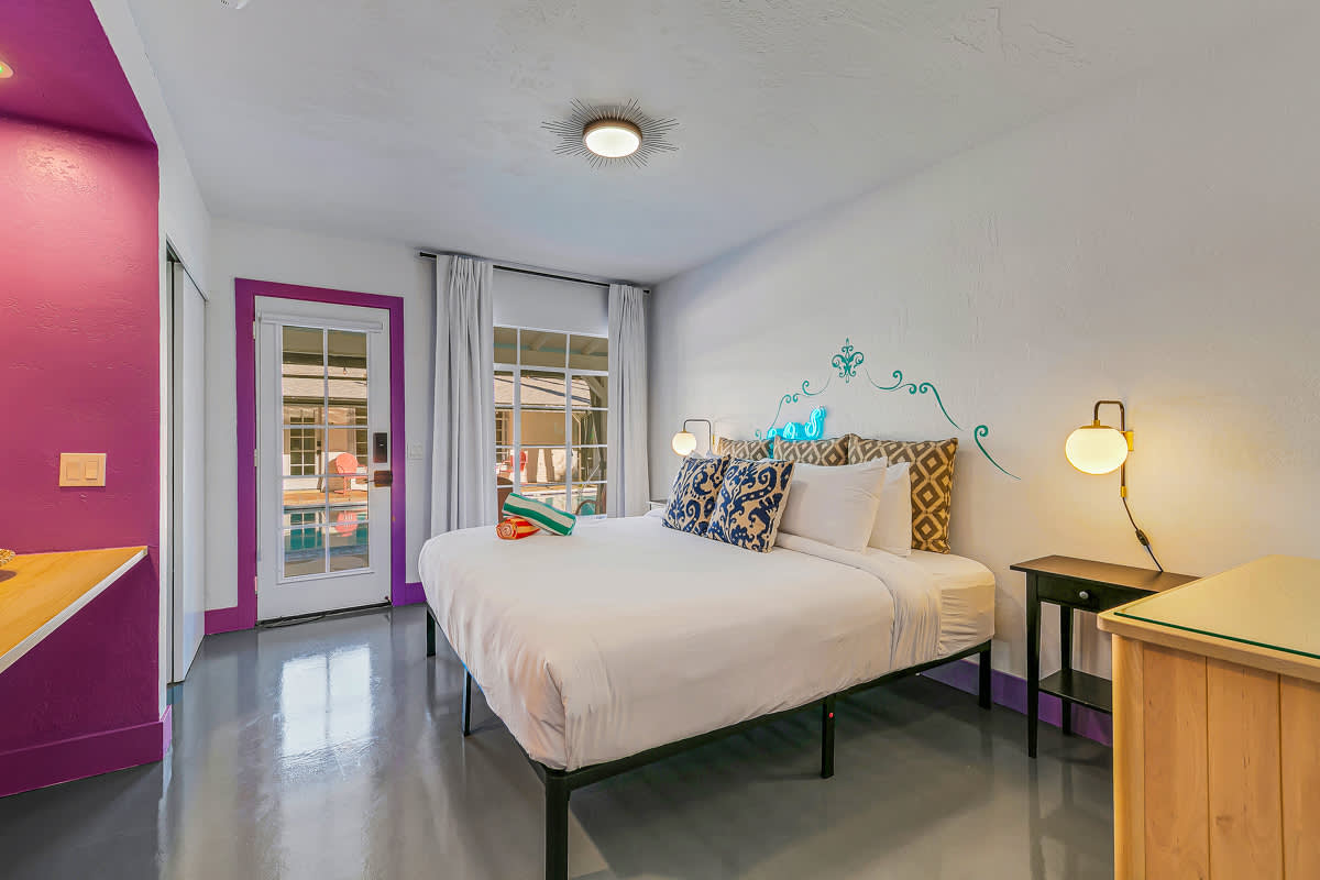 Spirit of Sofia’s Poolside Adventure is the most Palm Springiest experience in all of Palm Springs! Located in Downtown Palm Springs, Spirit of Sofia is framed by the backdrop of mountains, palm trees, and midcentury modern homes. Step outside your room/cabana and right into the pool. Spirit of Sofia has it all with heated pool, hot tub, grill, outdoor kitchen and dining, floaties, neon signs, bright colors, rainbows, road bikes, and ample cozy spaces 🙂
