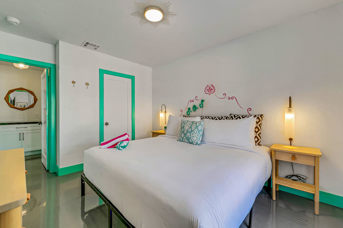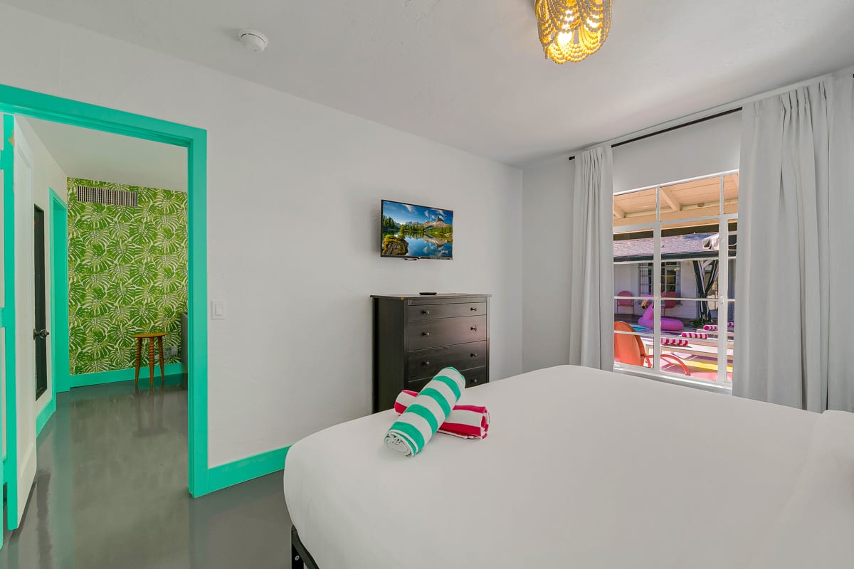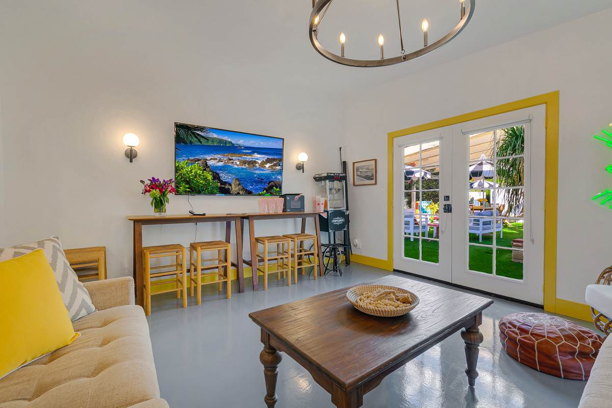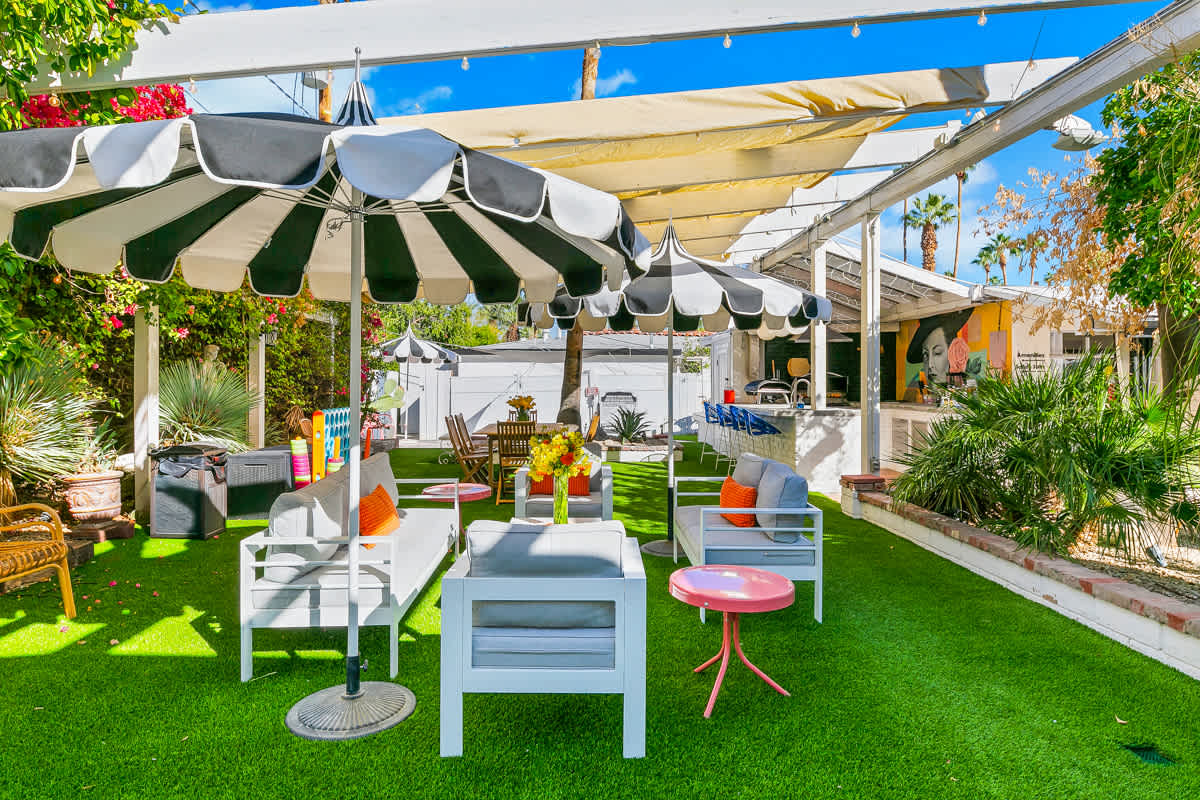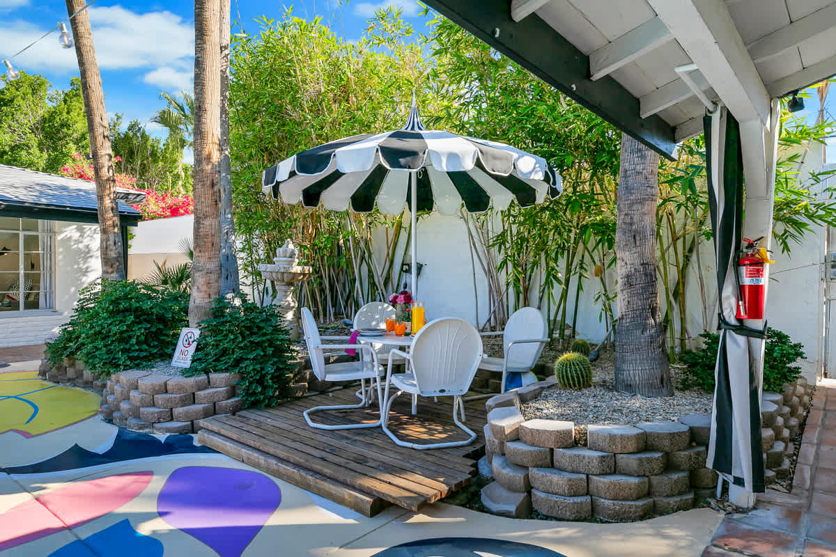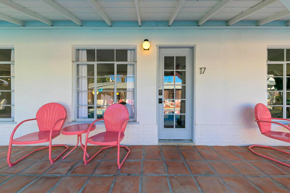 Spirit of Sofia’s Poolside Adventure is the most Palm Springiest experience in all of Palm Springs! Located in Downtown Palm Springs, Spirit of Sofia is framed by the backdrop of mountains, palm trees, and midcentury modern homes. Step outside your room/cabana and right into the pool. Spirit of Sofia has it all with heated pool, hot tub, grill, outdoor kitchen and dining, floaties, neon signs, bright colors, rainbows, road bikes, and ample cozy spaces 🙂