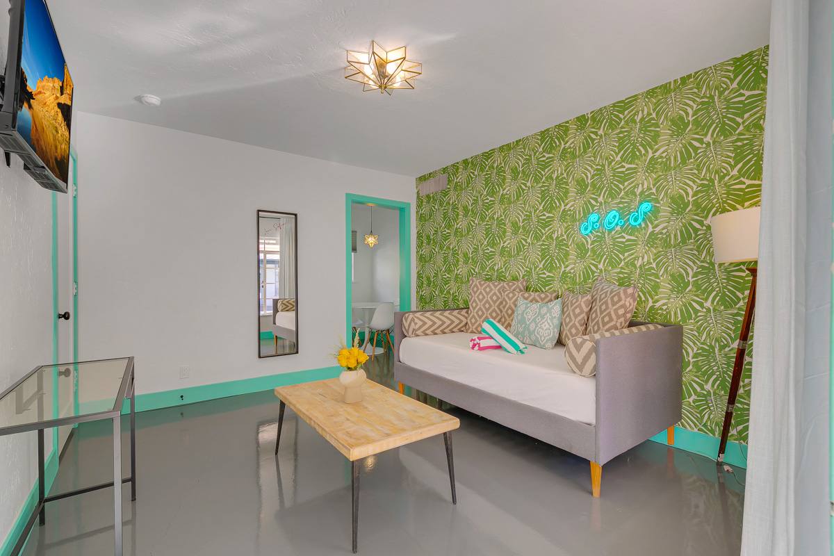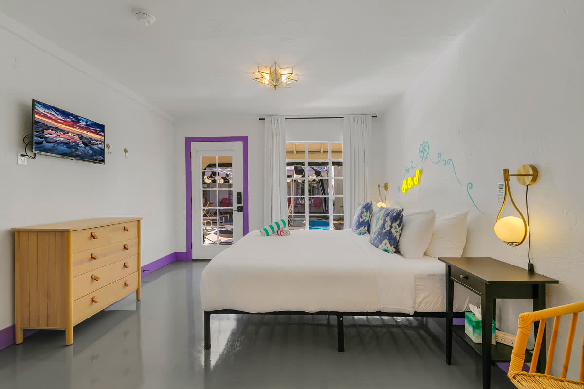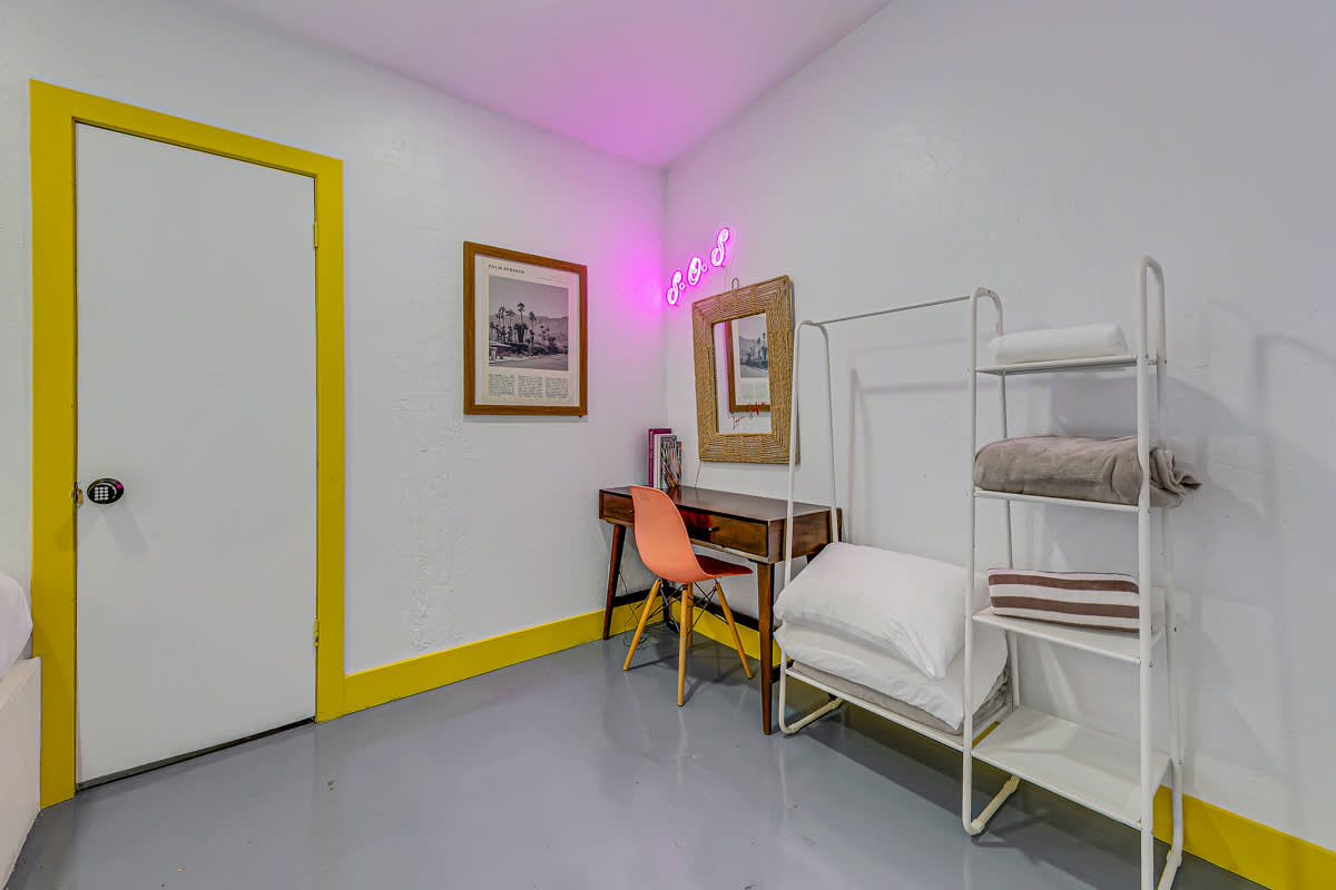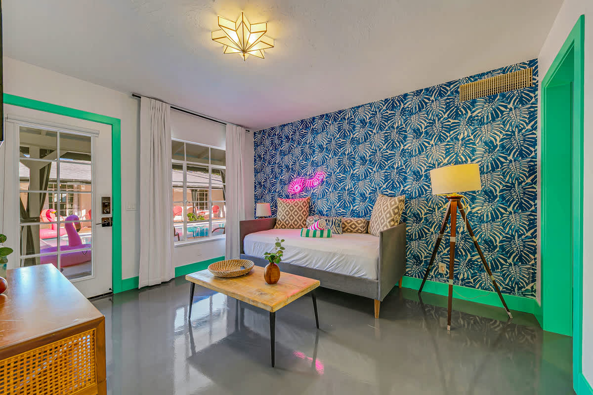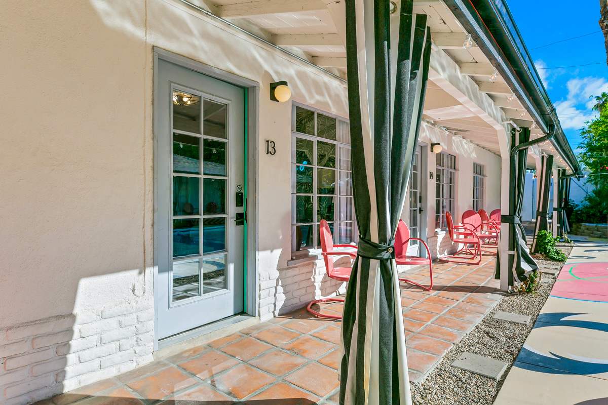 Spirit of Sofia’s Poolside Adventure is the most Palm Springiest experience in all of Palm Springs! Located in Downtown Palm Springs, Spirit of Sofia is framed by the backdrop of mountains, palm trees, and midcentury modern homes. Step outside your room/cabana and right into the pool. Spirit of Sofia has it all with heated pool, hot tub, grill, outdoor kitchen and dining, floaties, neon signs, bright colors, rainbows, road bikes, and ample cozy spaces 🙂