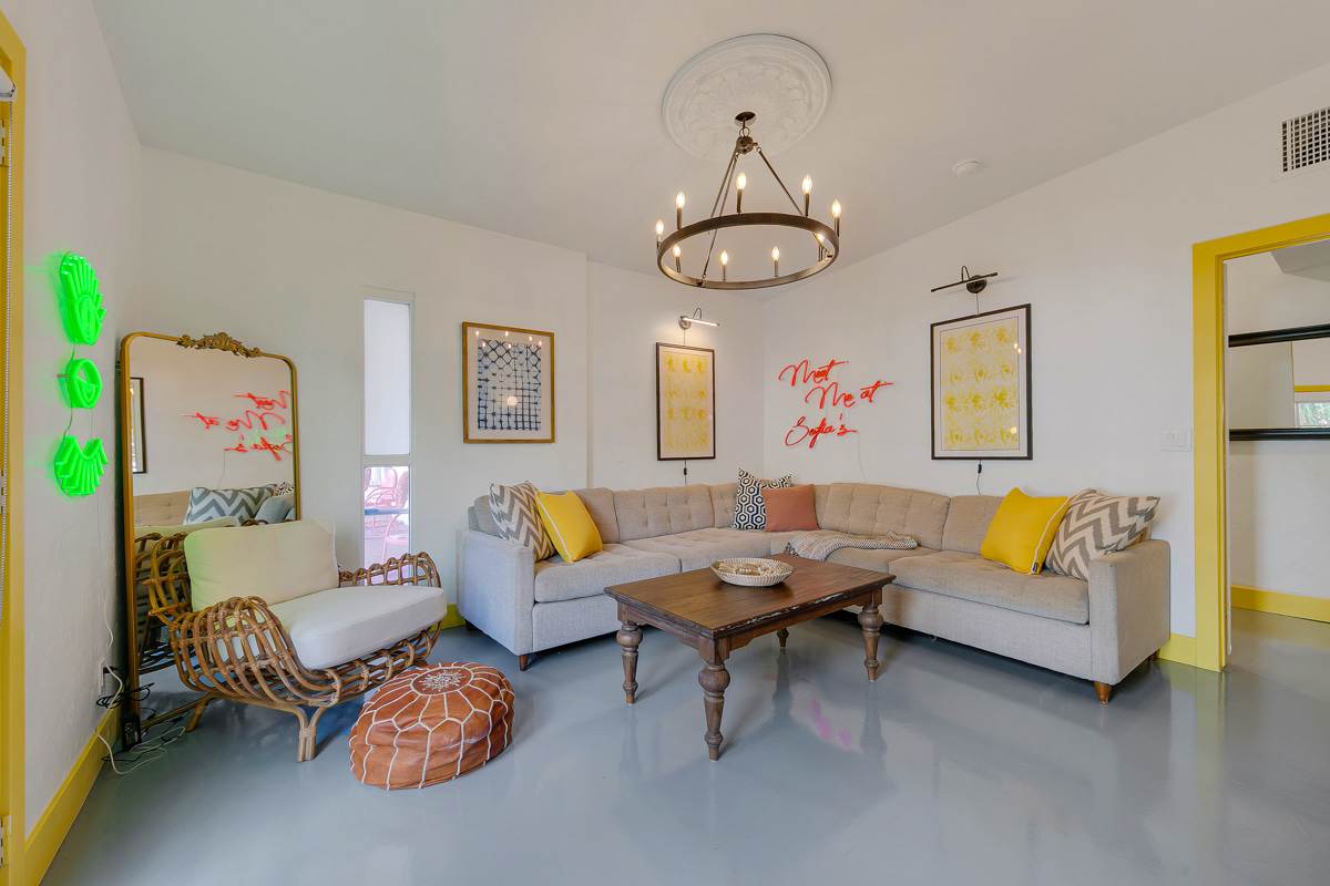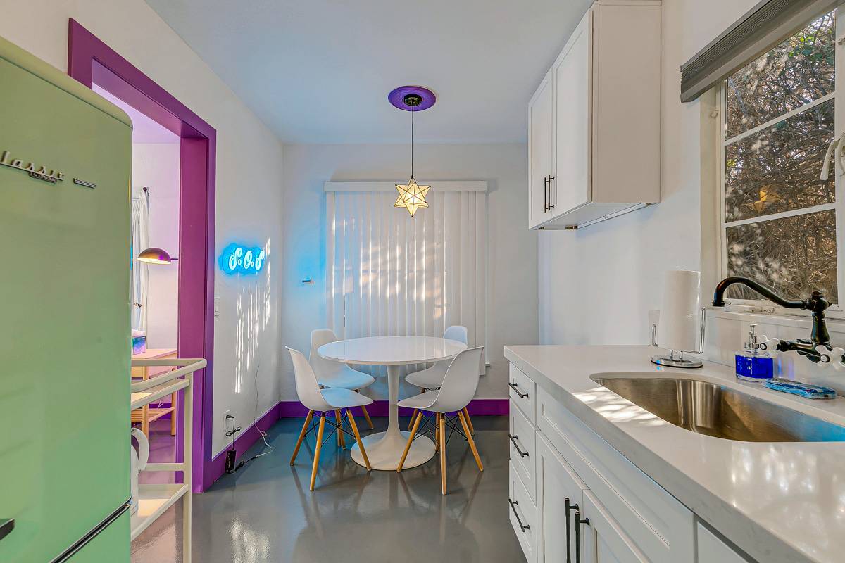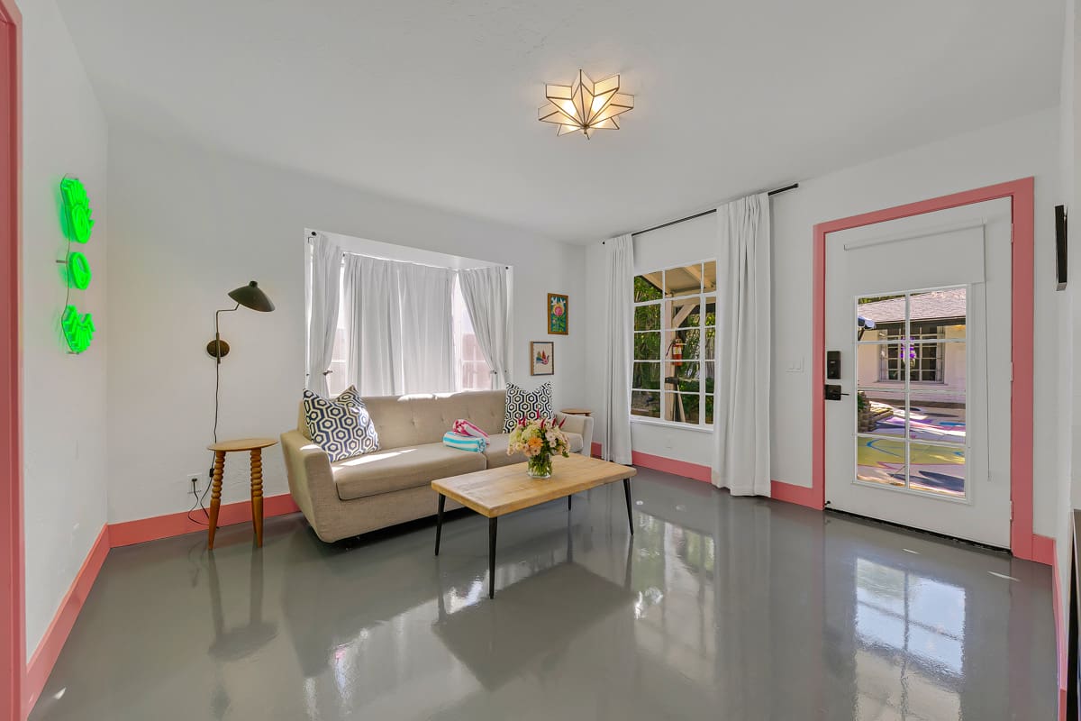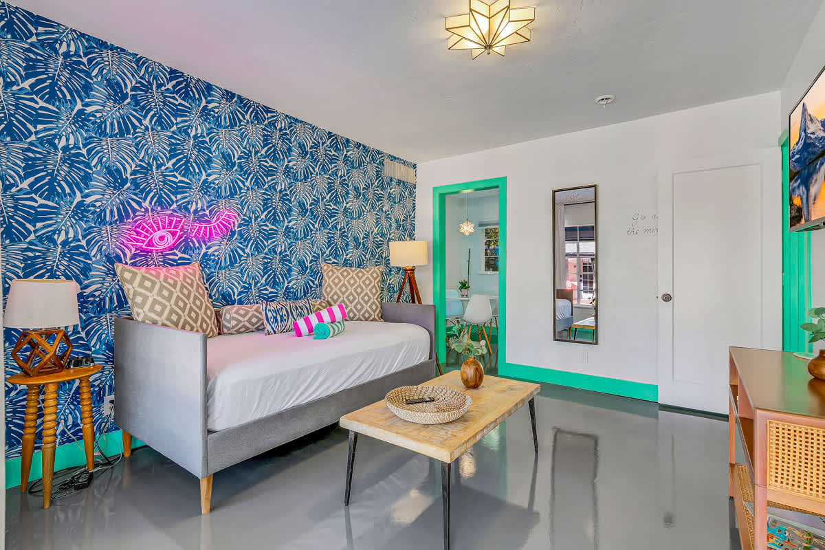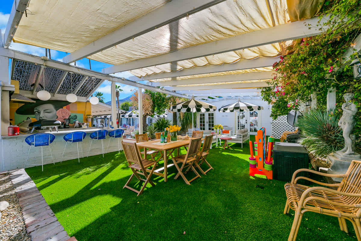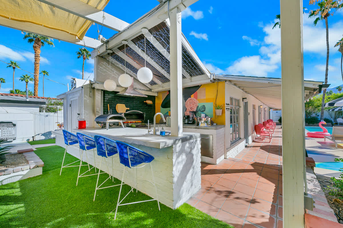 Spirit of Sofia’s Poolside Adventure is the most Palm Springiest experience in all of Palm Springs! Located in Downtown Palm Springs, Spirit of Sofia is framed by the backdrop of mountains, palm trees, and midcentury modern homes. Step outside your room/cabana and right into the pool. Spirit of Sofia has it all with heated pool, hot tub, grill, outdoor kitchen and dining, floaties, neon signs, bright colors, rainbows, road bikes, and ample cozy spaces 🙂