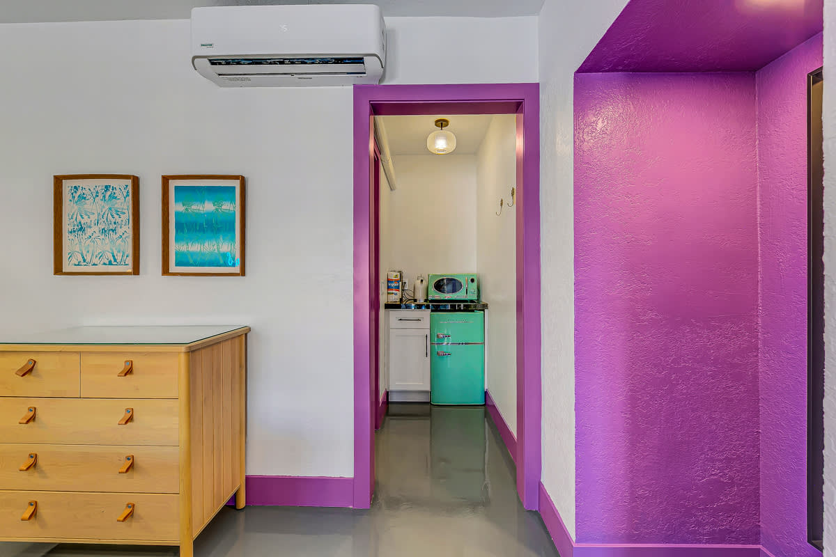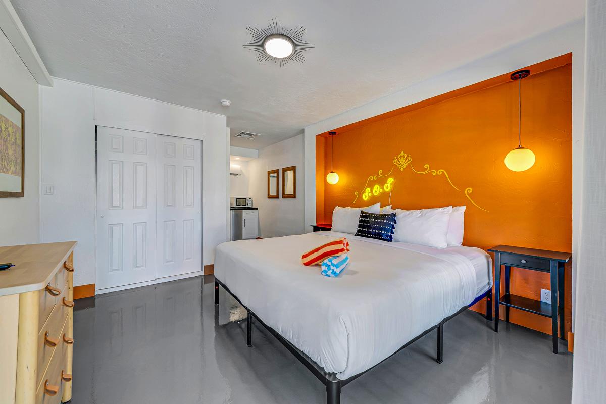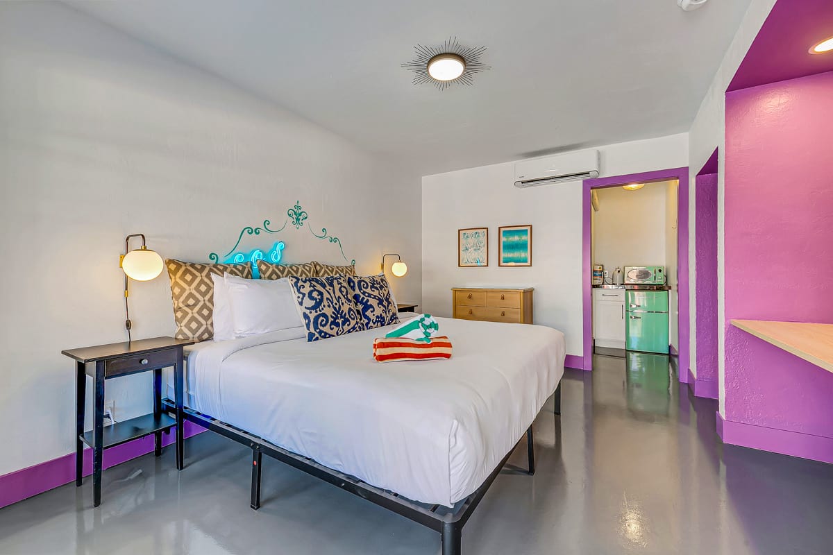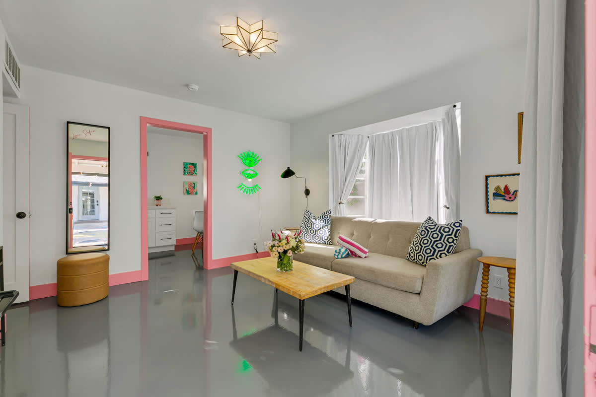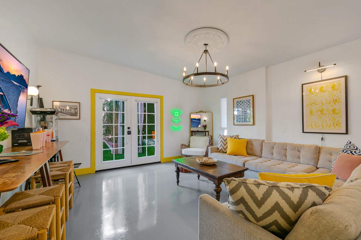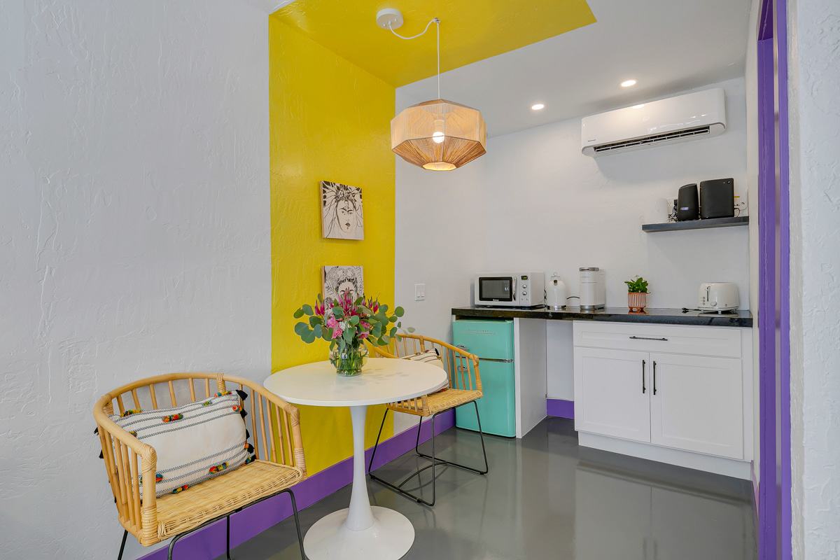 Spirit of Sofia’s Poolside Adventure is the most Palm Springiest experience in all of Palm Springs! Located in Downtown Palm Springs, Spirit of Sofia is framed by the backdrop of mountains, palm trees, and midcentury modern homes. Step outside your room/cabana and right into the pool. Spirit of Sofia has it all with heated pool, hot tub, grill, outdoor kitchen and dining, floaties, neon signs, bright colors, rainbows, road bikes, and ample cozy spaces 🙂