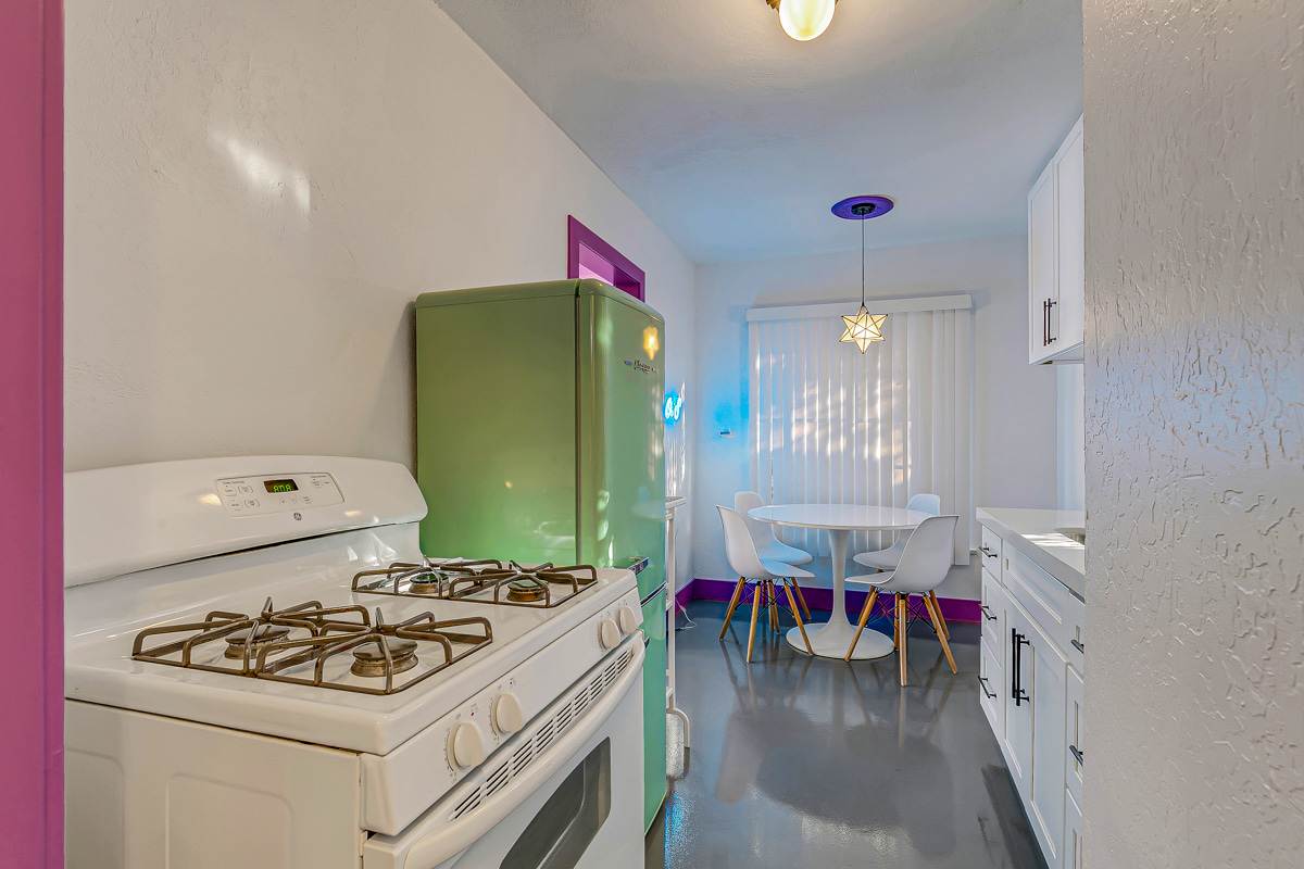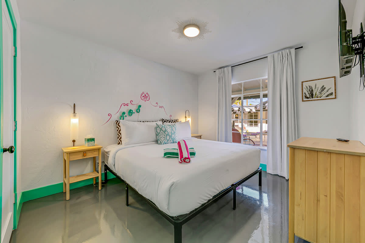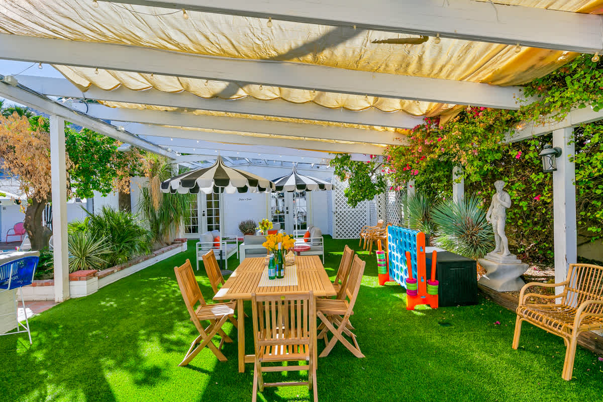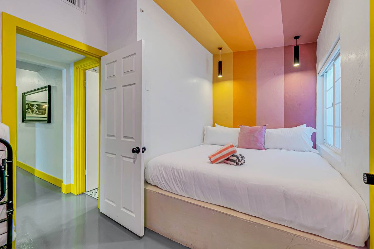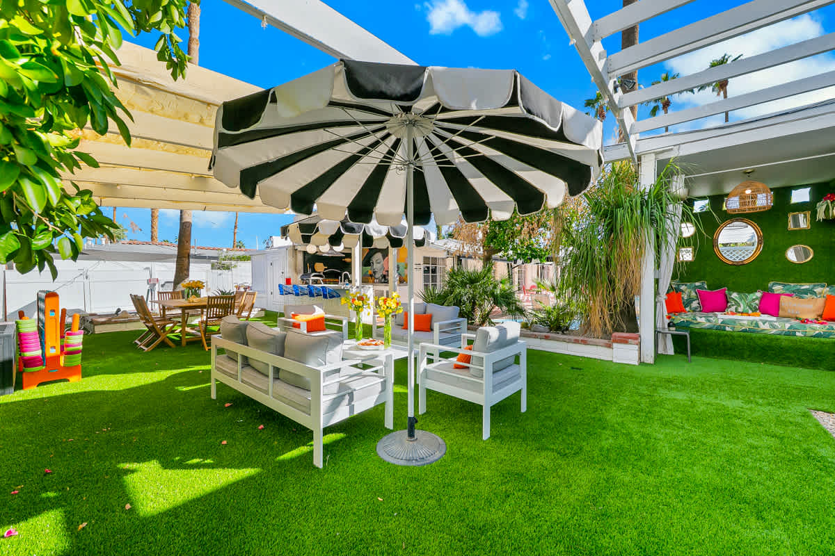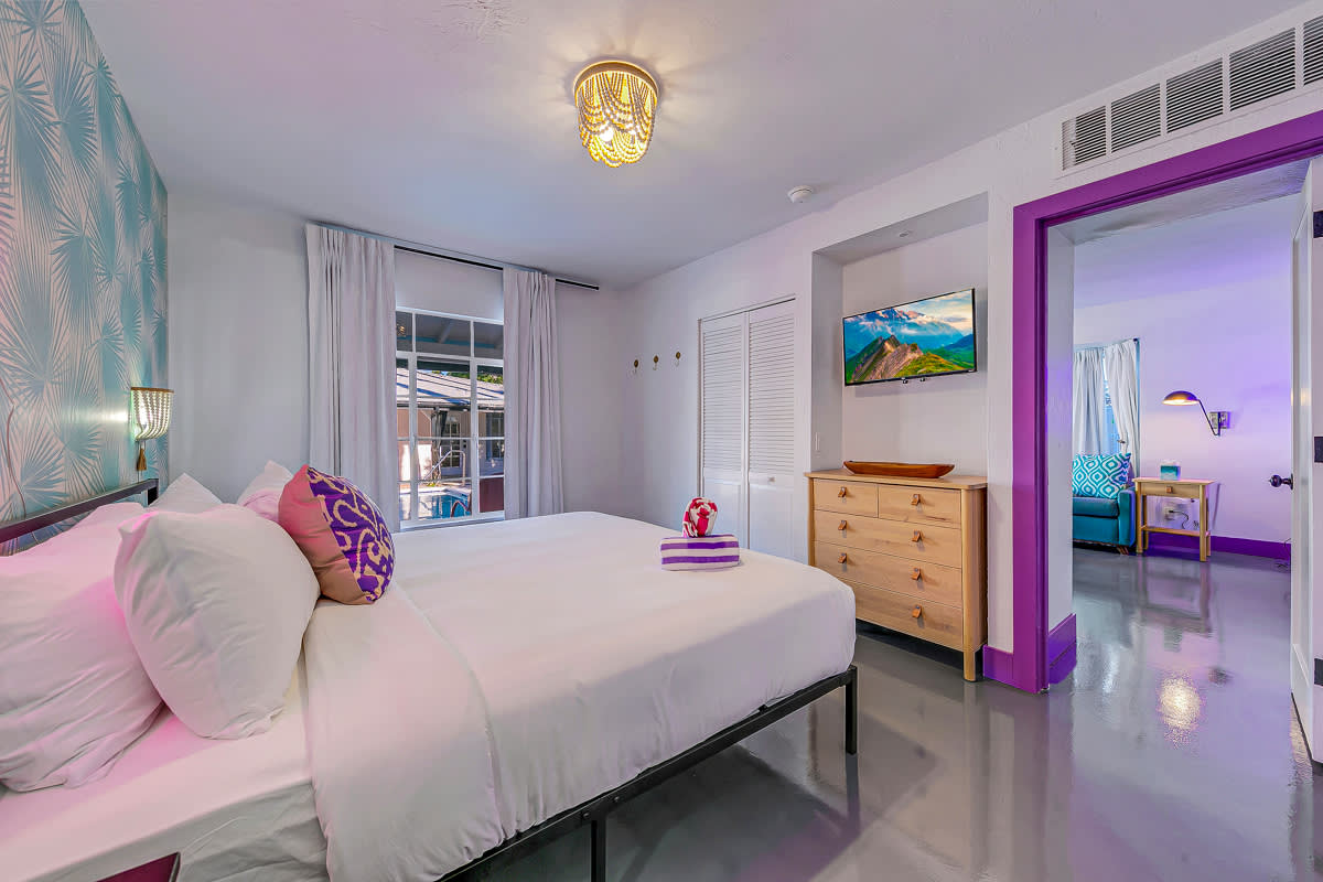 Spirit of Sofia’s Poolside Adventure is the most Palm Springiest experience in all of Palm Springs! Located in Downtown Palm Springs, Spirit of Sofia is framed by the backdrop of mountains, palm trees, and midcentury modern homes. Step outside your room/cabana and right into the pool. Spirit of Sofia has it all with heated pool, hot tub, grill, outdoor kitchen and dining, floaties, neon signs, bright colors, rainbows, road bikes, and ample cozy spaces 🙂