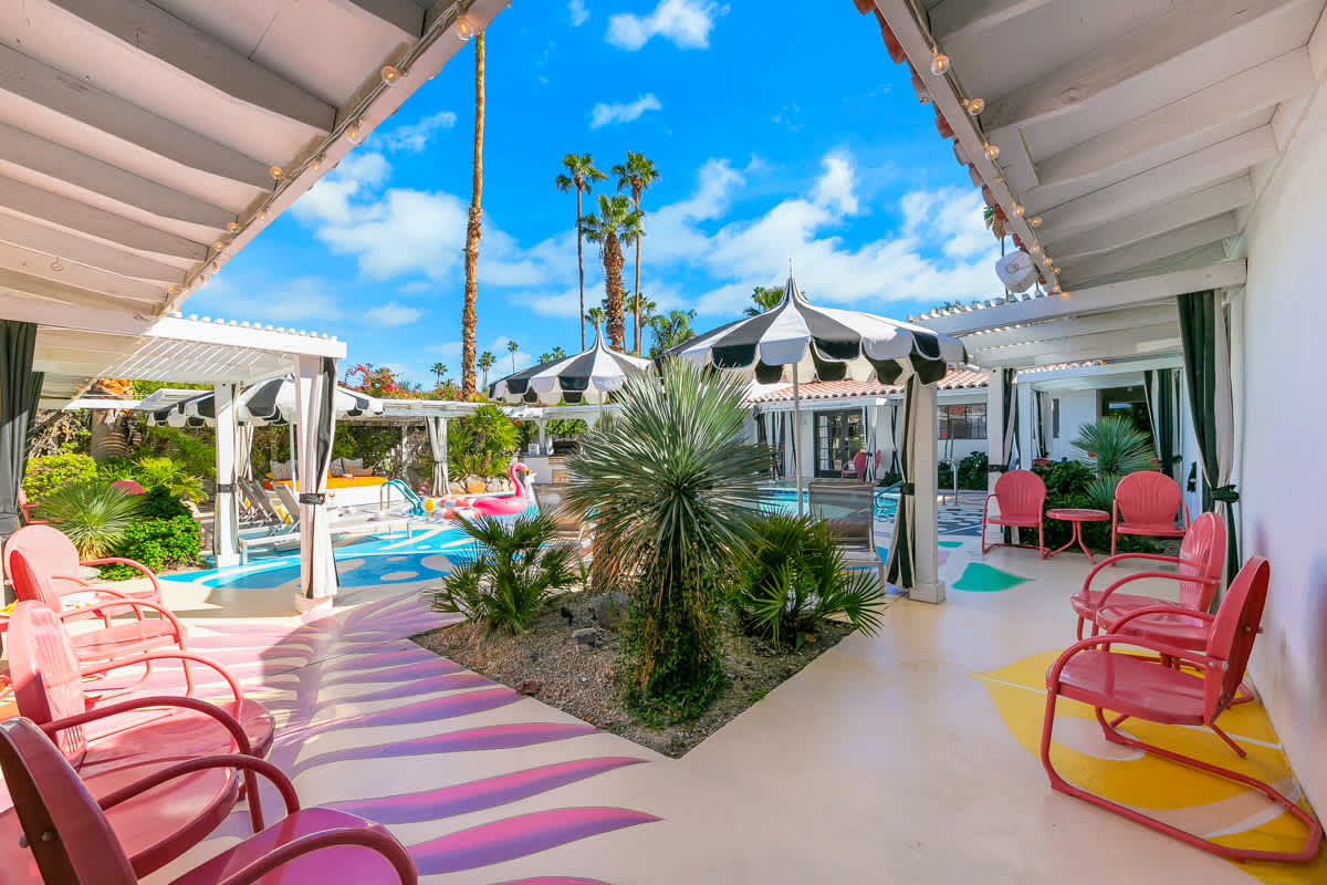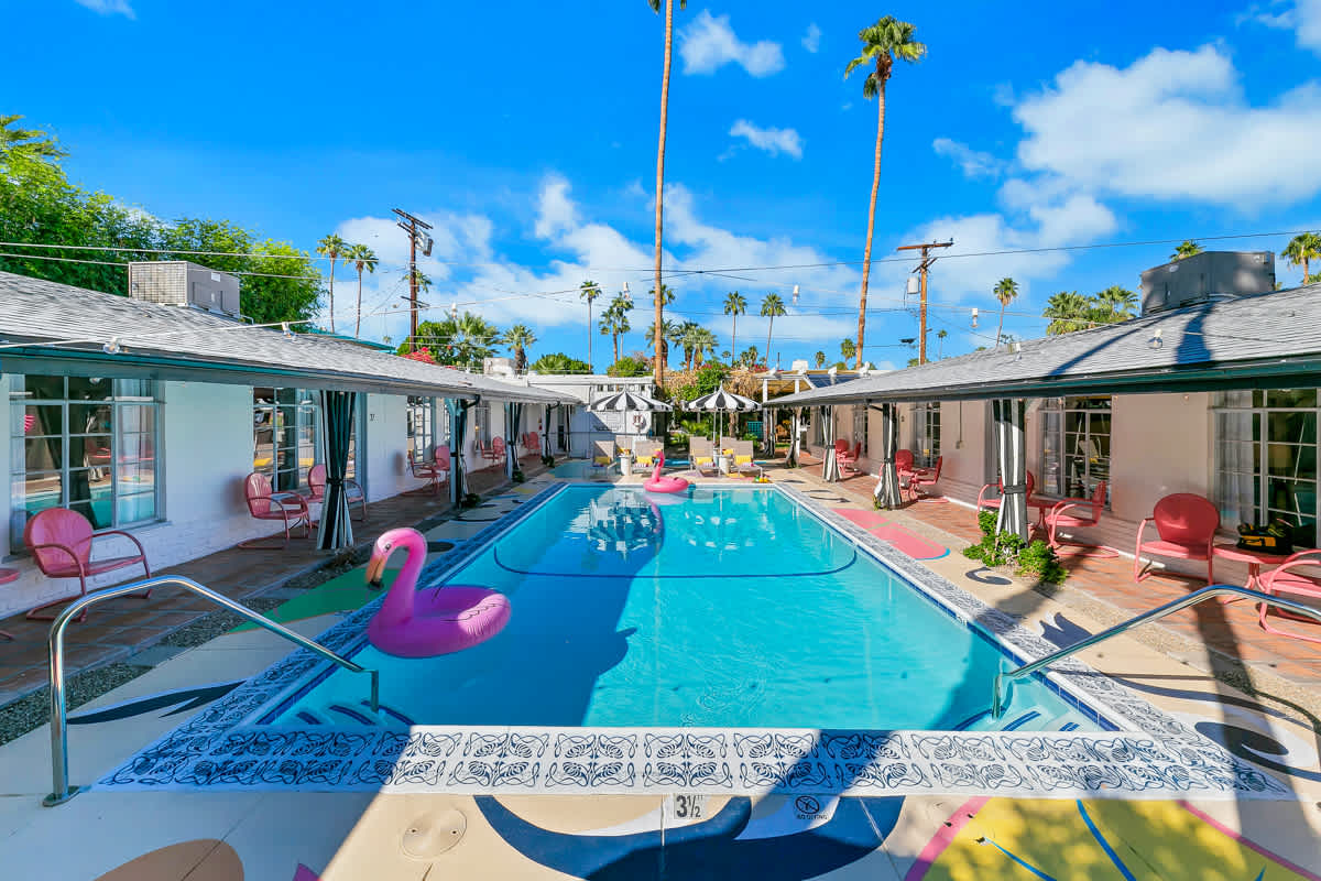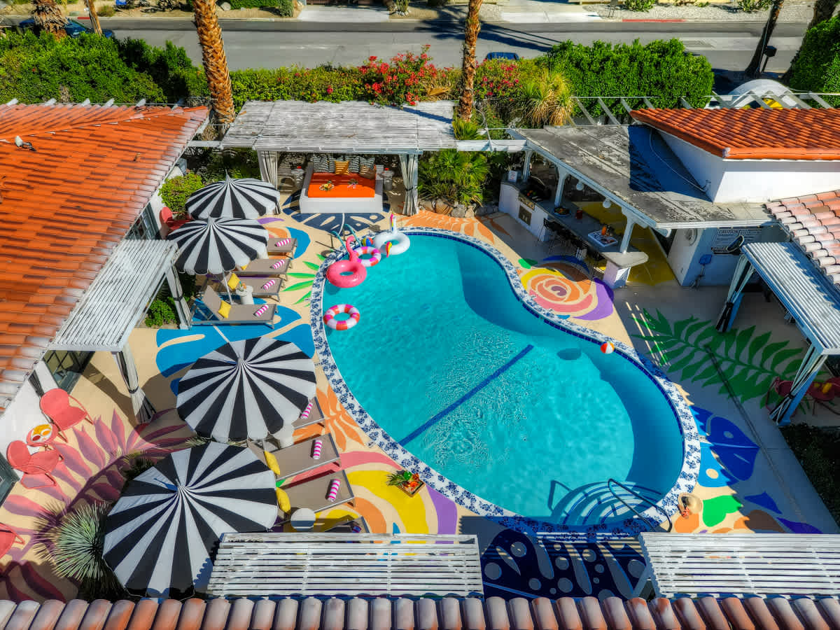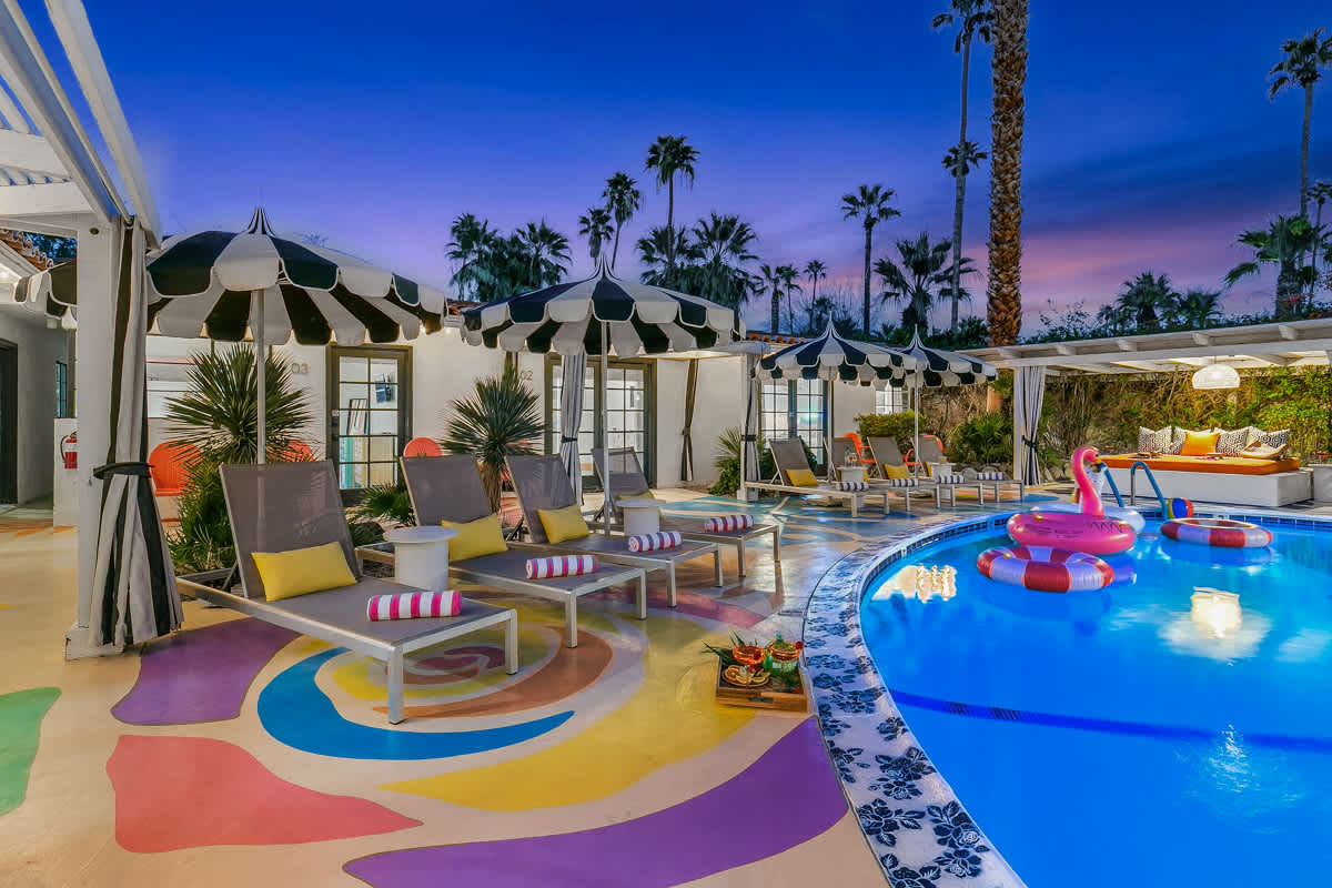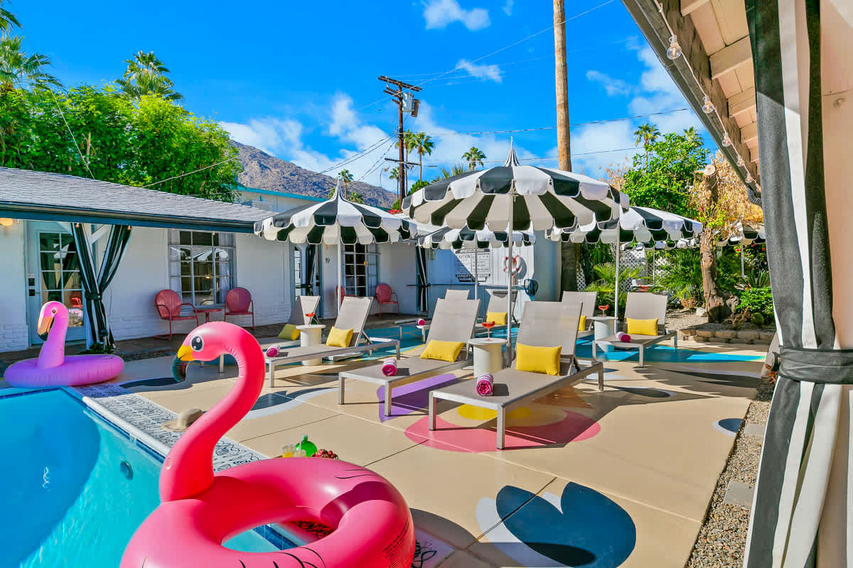 Complete hotel buyout! Sleeps 50+! Spirit of Sofia’s Poolside Adventure is the most Palm Springiest experience in all of Palm Springs! Located in Downtown Palm Springs, Spirit of Sofia is framed by the backdrop of mountains, palm trees, and midcentury modern homes. Step outside your room and right into the pool. Spirit of Sofia has it all with heated pools, hot tubs, grills, outdoor dining, ample poolside seating, floaties, neon signs, rainbows, road bikes, and even a life-size chess board!