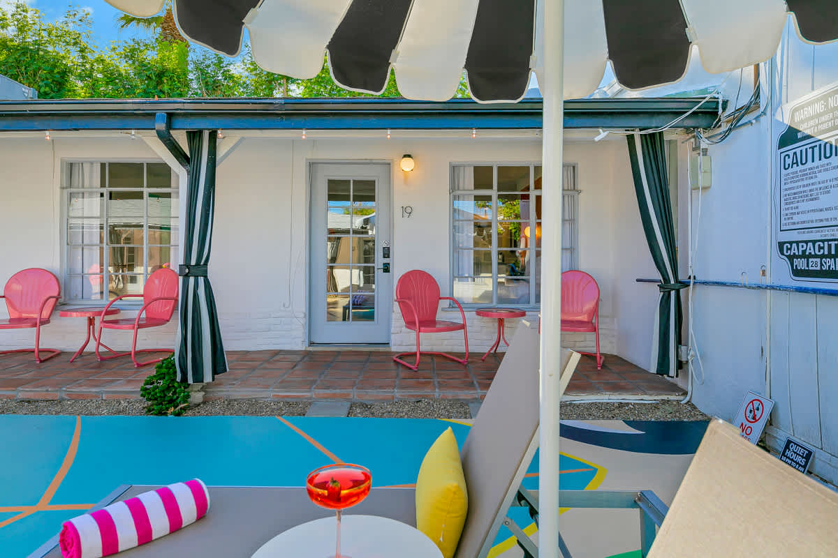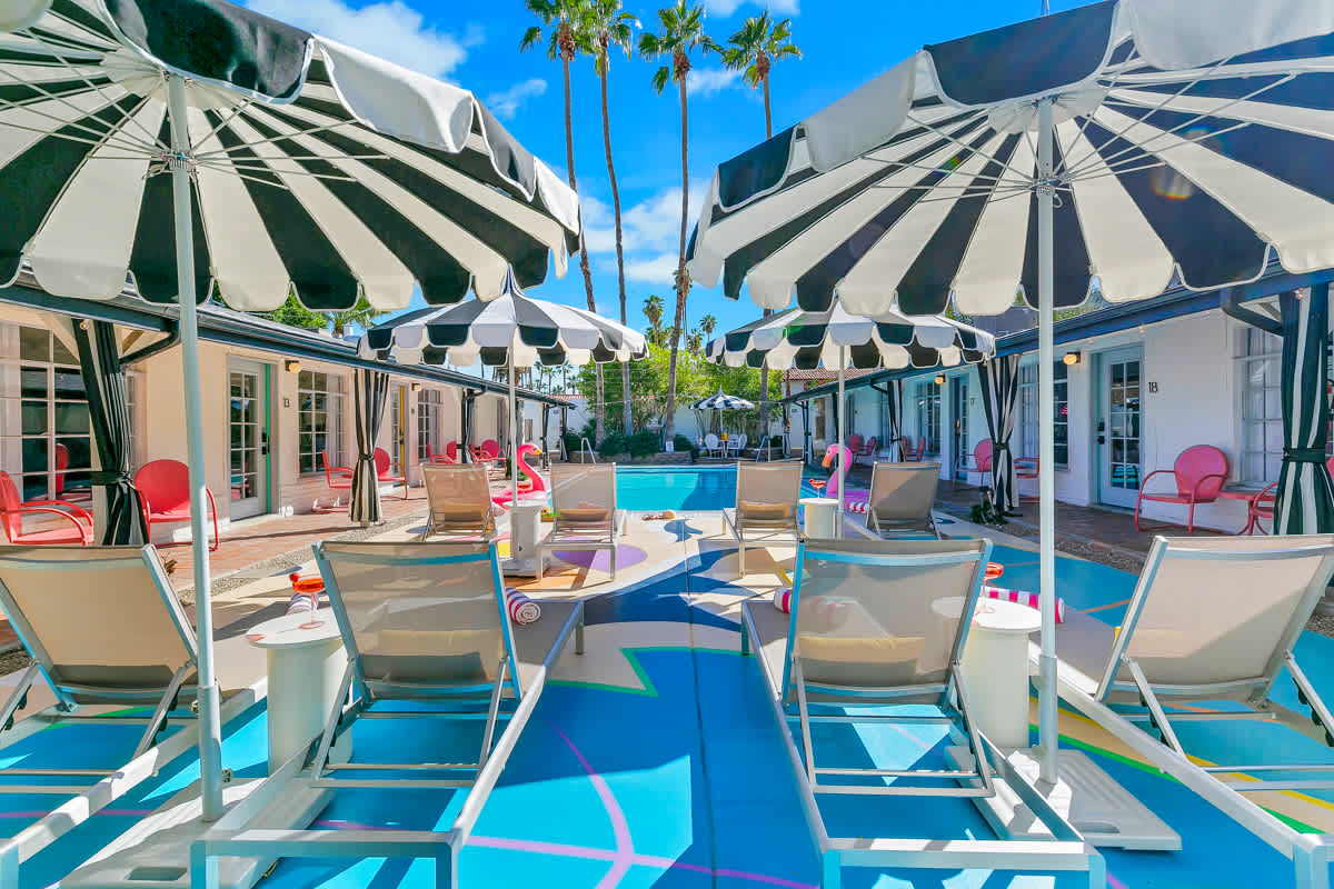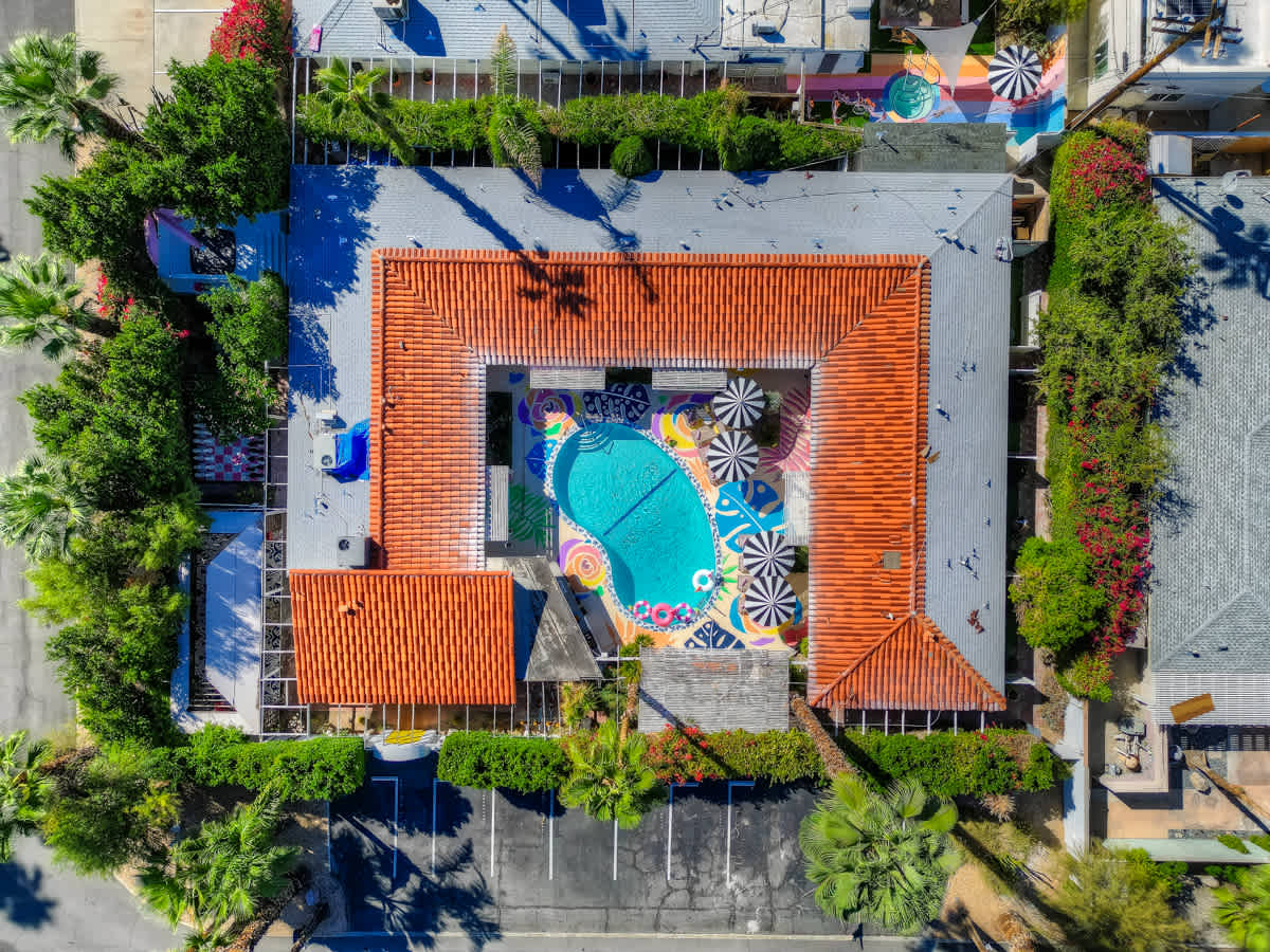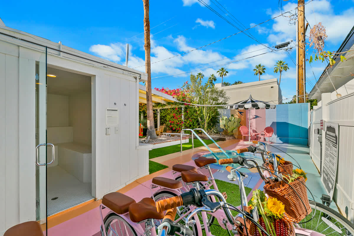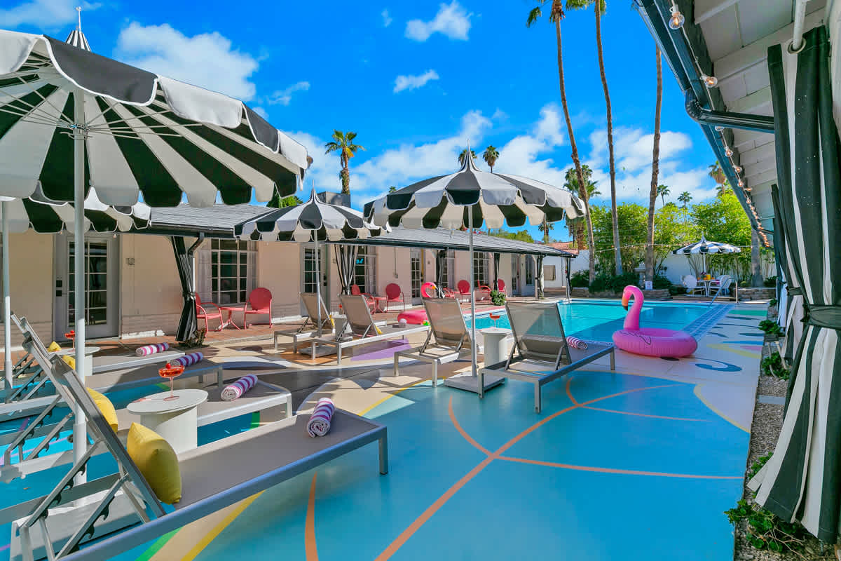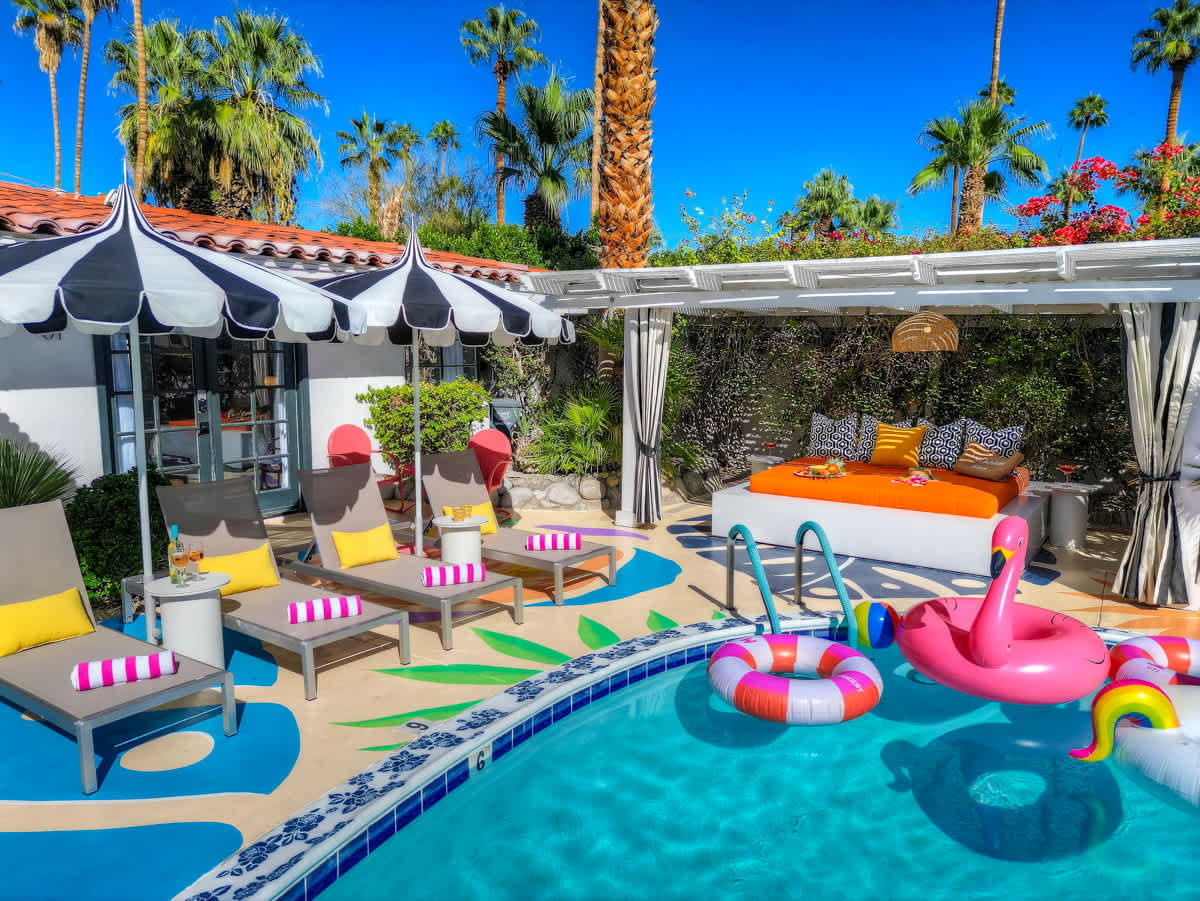 Complete hotel buyout! Sleeps 50+! Spirit of Sofia’s Poolside Adventure is the most Palm Springiest experience in all of Palm Springs! Located in Downtown Palm Springs, Spirit of Sofia is framed by the backdrop of mountains, palm trees, and midcentury modern homes. Step outside your room and right into the pool. Spirit of Sofia has it all with heated pools, hot tubs, grills, outdoor dining, ample poolside seating, floaties, neon signs, rainbows, road bikes, and even a life-size chess board!