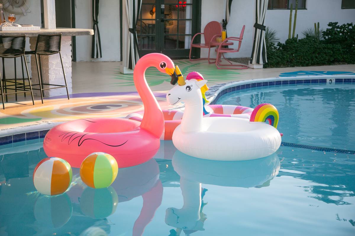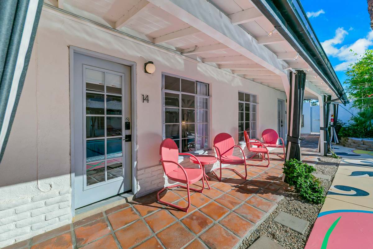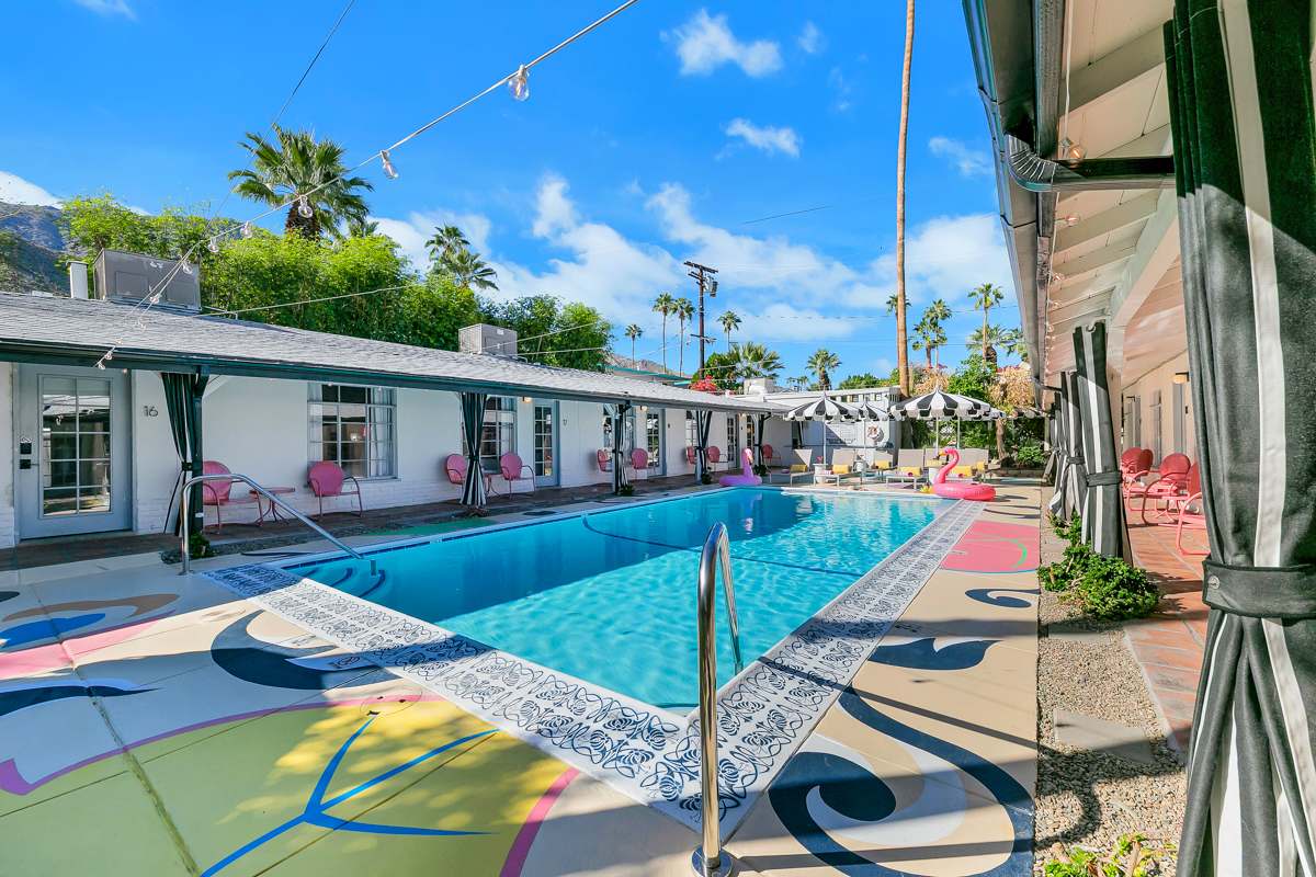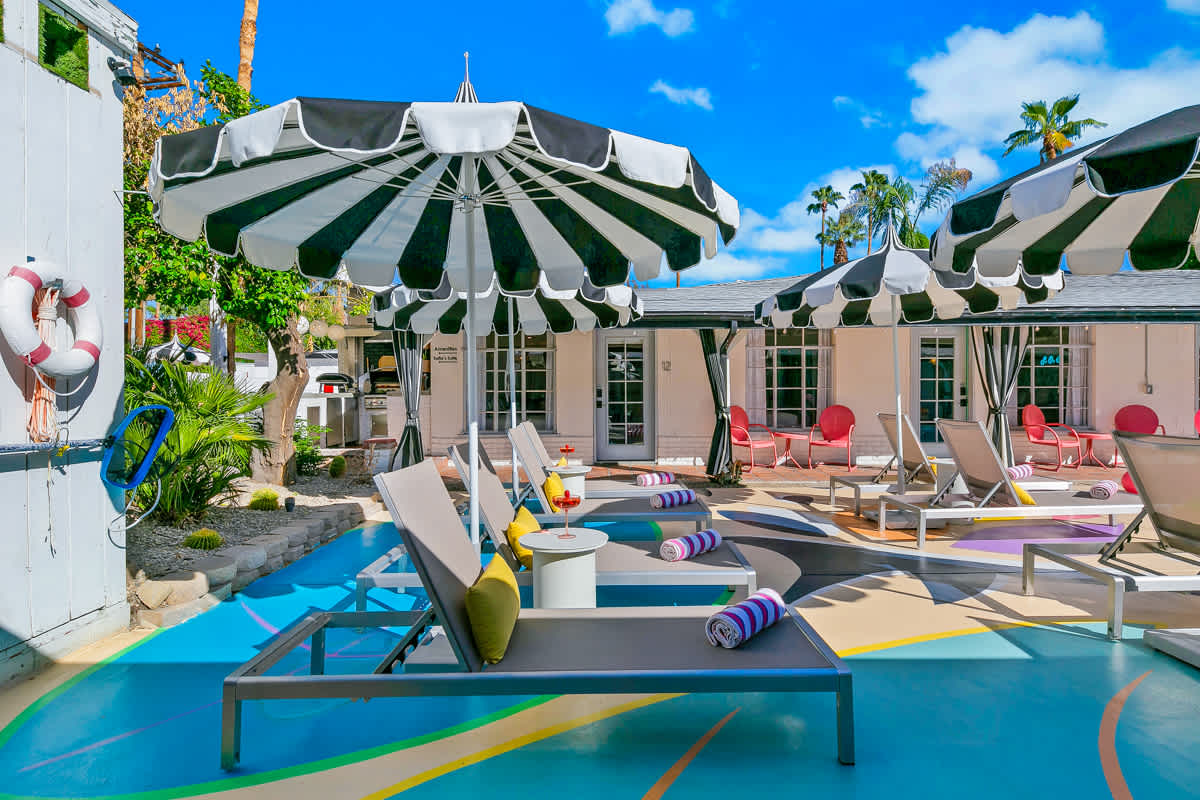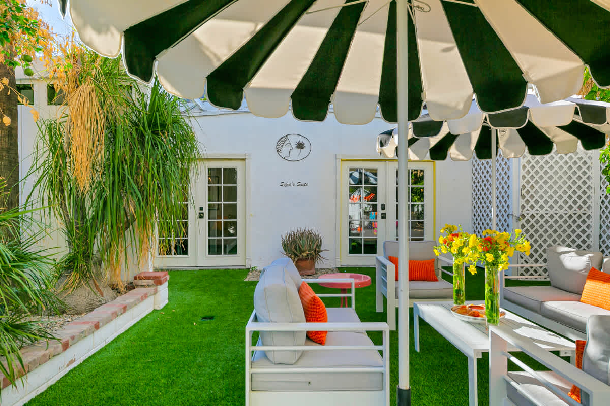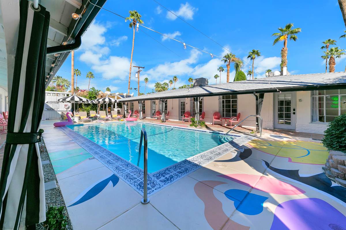 Complete hotel buyout! Sleeps 50+! Spirit of Sofia’s Poolside Adventure is the most Palm Springiest experience in all of Palm Springs! Located in Downtown Palm Springs, Spirit of Sofia is framed by the backdrop of mountains, palm trees, and midcentury modern homes. Step outside your room and right into the pool. Spirit of Sofia has it all with heated pools, hot tubs, grills, outdoor dining, ample poolside seating, floaties, neon signs, rainbows, road bikes, and even a life-size chess board!