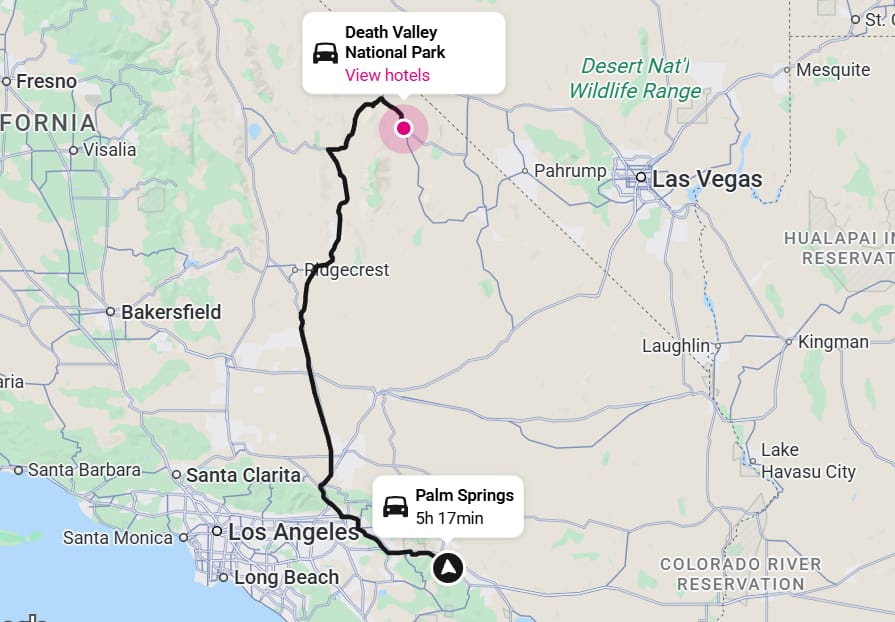 From Palm Springs, Death Valley is roughly 300 miles away. Driving time usually falls between 5.5 to 6.5 hours.