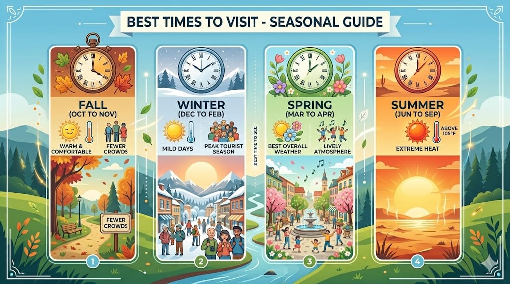 Many travelers avoid visiting during peak summer (June–September) when temperatures often exceed 110°F (43°C). If you’re sensitive to extreme heat, late summer can make outdoor activities uncomfortable.
