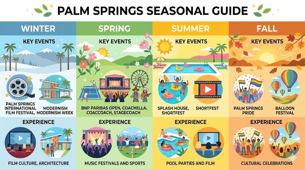 A random weekend might coincide with a massive music gathering like Coachella Valley Music and Arts Festival, a cinema celebration such as Palm Springs Film Festival, or colorful community moments like Palm Springs Pride.