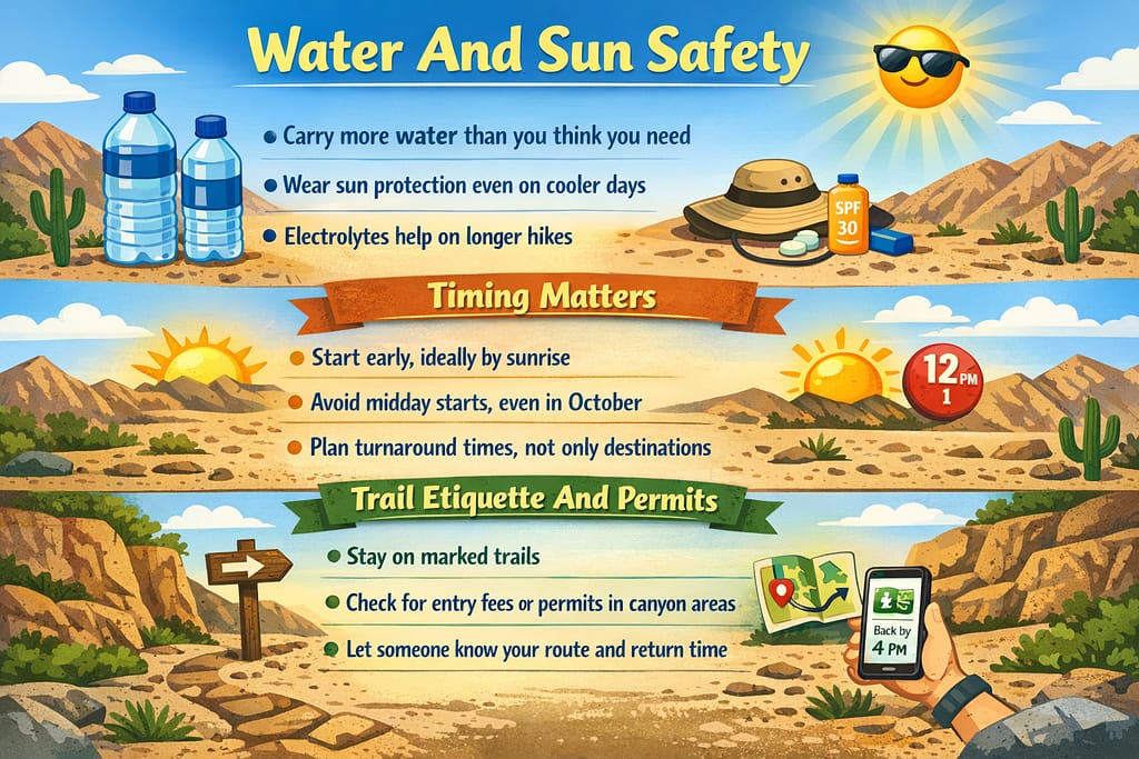 - Hiking permits and canyon hours change seasonally. Check the night before, always.